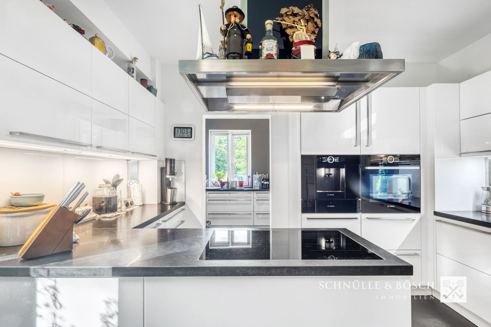 Die hochwertige, offene Küche mit ihrer beeindruckenden Granitarbeitsplatte lädt zum kreativen Kochen und geselligen Beisammensein ein. An kühleren Abenden schaffen Sie am Kamin eine behagliche Stimmung.