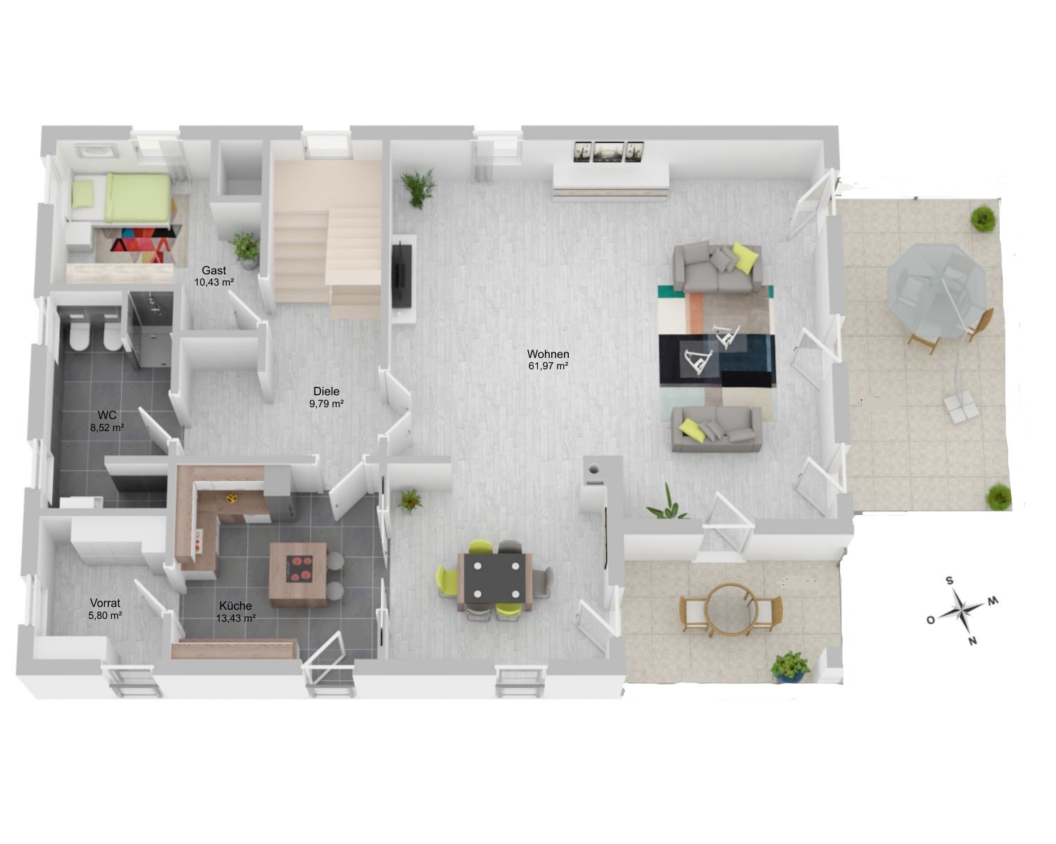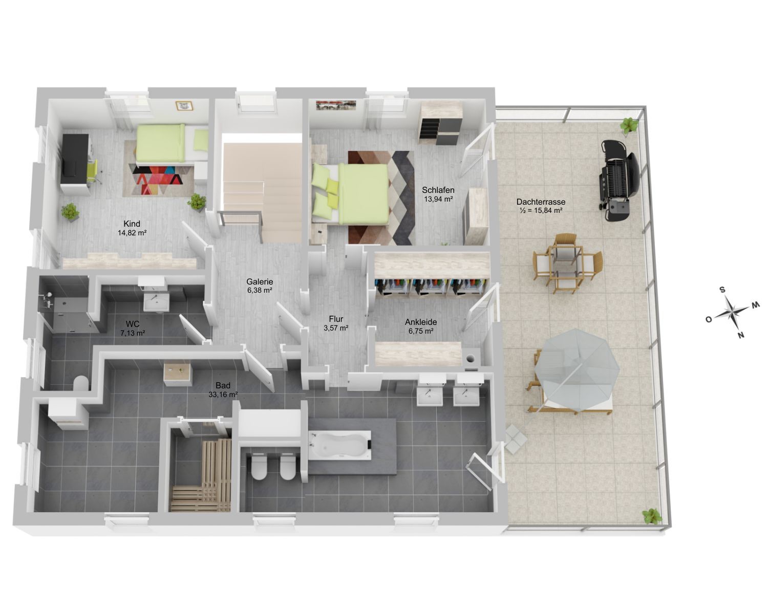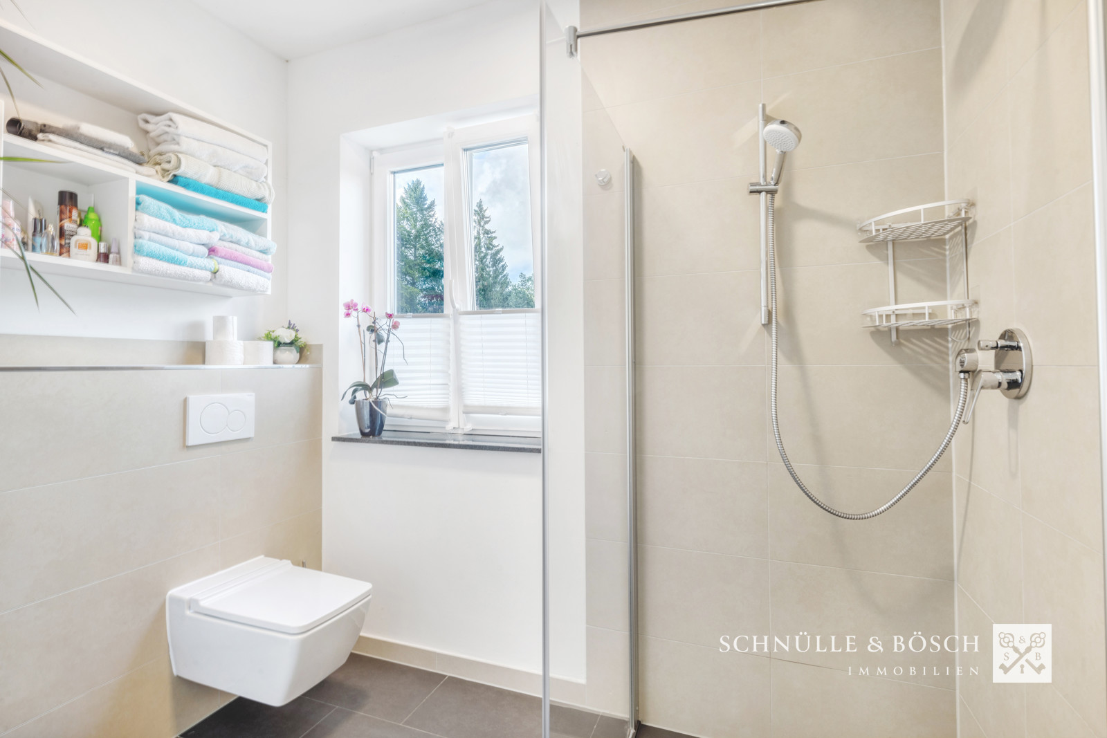 Genießen Sie das Leben im Freien auf zwei Terrassen und vor allem auf Ihrer exklusiven Dachterrasse. Von hier aus schweift Ihr Blick den angrenzenden Staatsforst – eine unbezahlbare Kulisse für Ihren Feierabend.