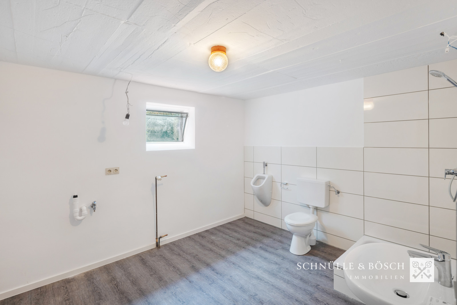 Vom Flur aus geht es auch in den Keller. Das Haus ist vollständig unterkellert und durch die leichte Hanglage erhält dieser Bereich auf der Ostseite viel Tageslicht. Der Keller mit seinen knapp 132 m² bietet ausreichend Platz für Hobbys, Fitnessraum, Spielzimmer und weiteren Stauraum. Mit einem eigenen Außenzugang können Sie sich direkt nach der Gartenarbeit im Keller umziehen und der Schmutz bleibt außerhalb des Wohnbereiches. Auch für eine Werkstatt, einen Partyraum oder die Carrera-Bahn ist hier Platz.