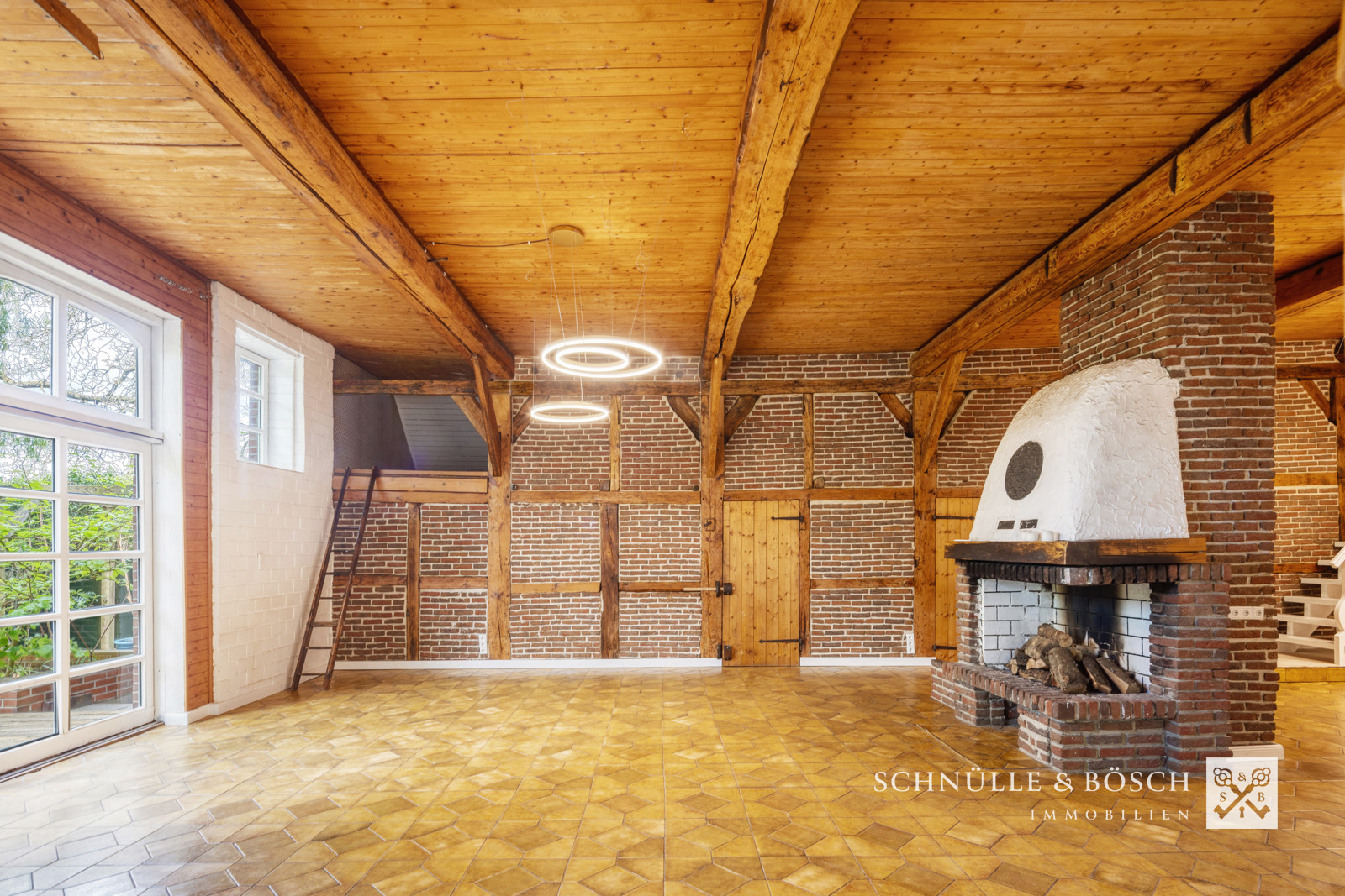Der großzügige Wohn- und Essbereich mit seinen ca. 100m² Größe, wird durch den offenen Kamin ergänzt, der an kühlen Abenden für eine warme und einladende Atmosphäre sorgt. Die sonnige Terrasse lädt dazu ein, entspannte Stunden im Freien zu verbringen und den Garten zu genießen.