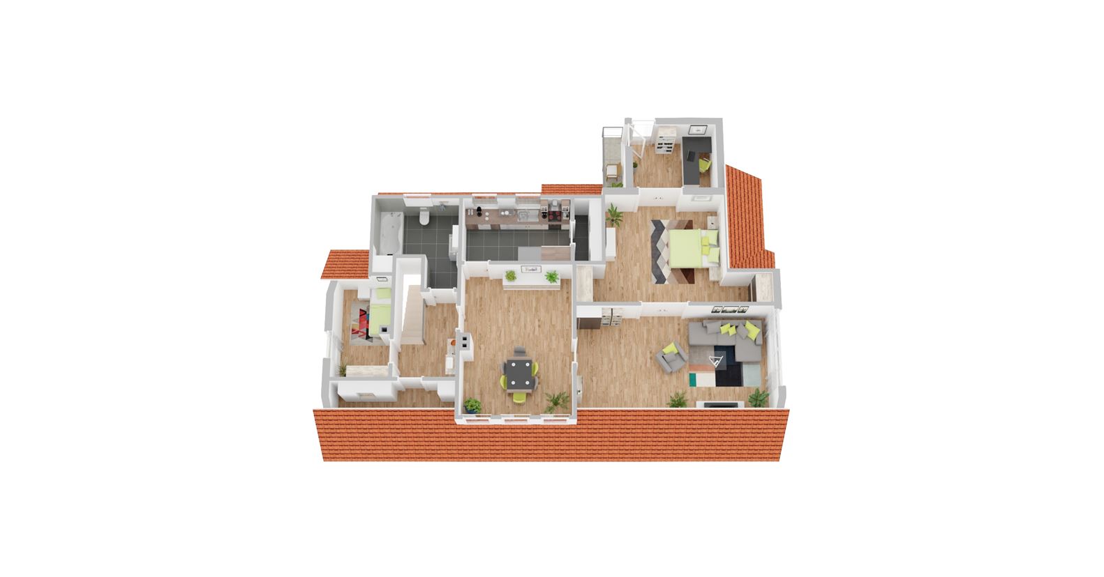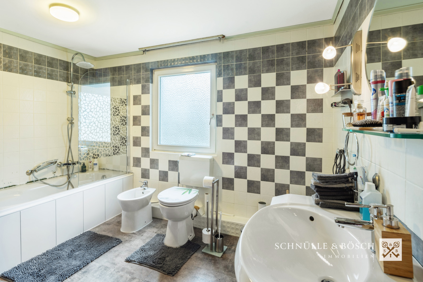 Wohnzimmer, Esszimmer, Schlafzimmer, Küche, Badezimmer mit Wanne, Büro, Gästezimmer