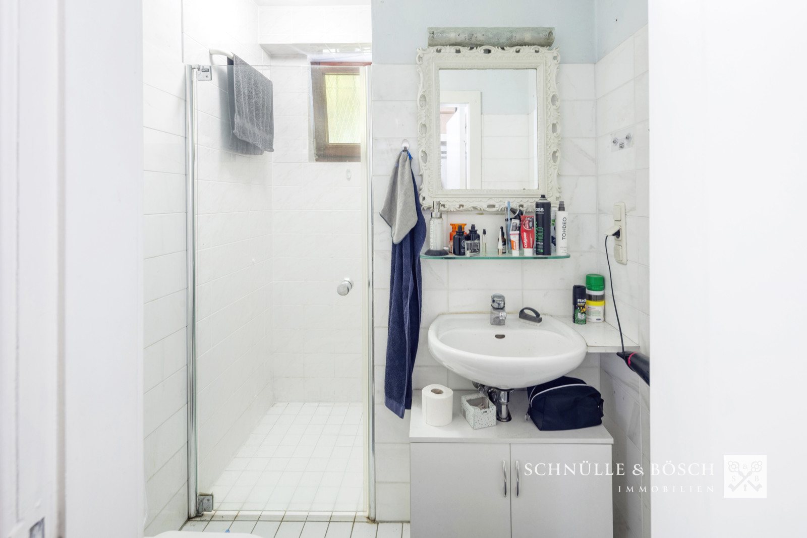 Wohnzimmer, Küche, Schlafzimmer, Badezimmer mit Dusche, Abstellraum