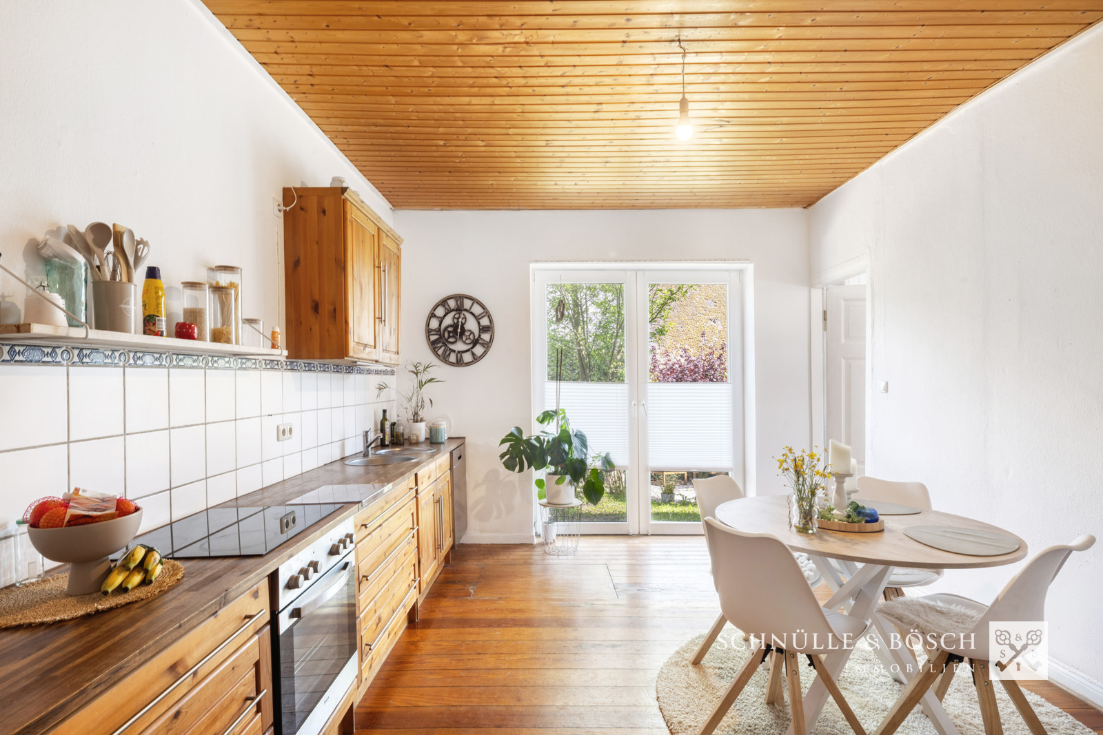 Der großzügige Wohn- und Essbereich mit seinen ca. 100m² Größe, wird durch den offenen Kamin ergänzt, der an kühlen Abenden für eine warme und einladende Atmosphäre sorgt. Die sonnige Terrasse lädt dazu ein, entspannte Stunden im Freien zu verbringen und den Garten zu genießen.