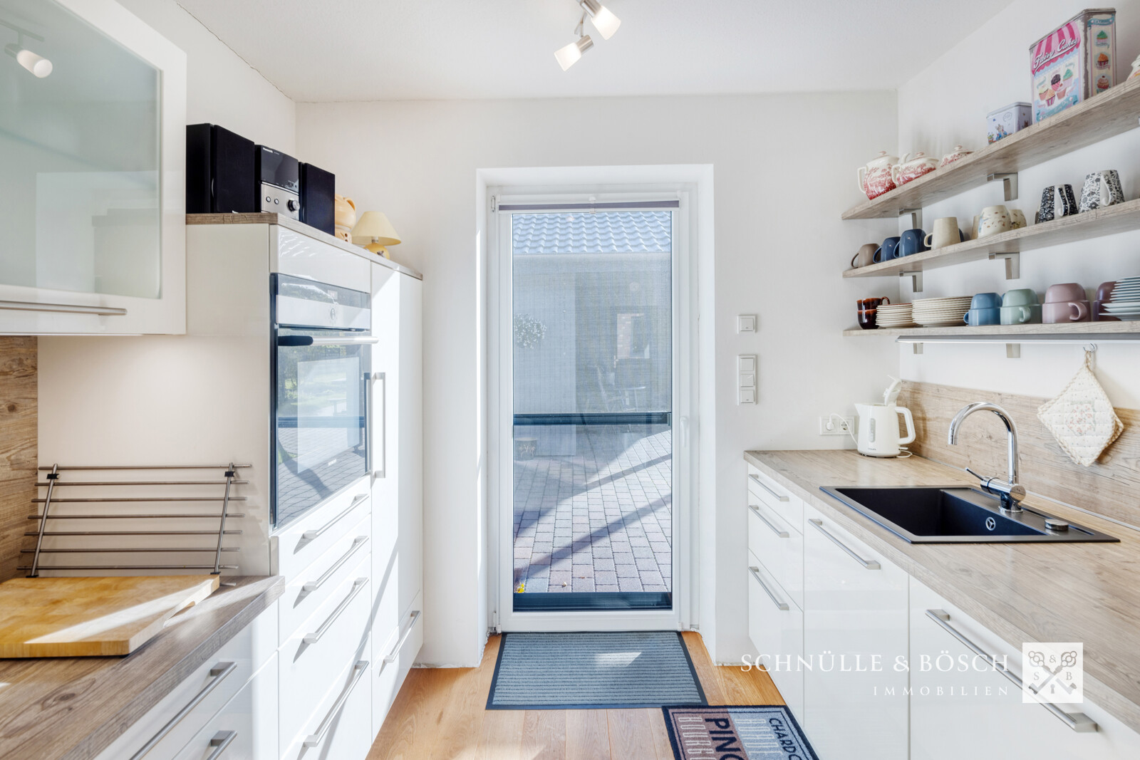 Herzlich Willkommen! Durch die hochwertige Hauseingangstür gelangen Sie ebenerdig in den Eingangsbereich dieses schönen Hauses. Von hier aus geht es direkt in den offenen Wohn- und Essbereich, der das Herzstück des Hauses bildet. Der aufgesetzte Specksteinofen der finnischen Marke TULIKIVI hat eine Speicherleistung von 2kW. Sie können damit alle Bereiche des Hauses mit einer wohligen Wärme erreichen und somit aktiv Heizkosten einsparen. Die halboffene Küche ist an den Essbereich angeschlossen und durch die Terrassentür erreichen Sie den rückwertigen Garten und das Nebengebäude. Der Hauswirtschaftsraum ist besonders gut durchdacht, dank eingebauter Regale, einem Waschbecken, einem Wandheizkörper und der Nebeneingangstür, die direkt ins Carport führt, können Sie in diesem Multifunktionsraum alles erledigen, was täglich anfällt und keinen Platz im Wohnbereich finden soll. Die Raumaufteilung umfasst weiter zwei helle Schlafzimmer, eines davon mit eigener Terrasse. Zusätzlich runden ein Badezimmer mit ebenerdiger Dusche, ein Gäste-WC und ein Büro oder kleines Gästezimmer, das Raumkonzept dieses Bungalows ab.