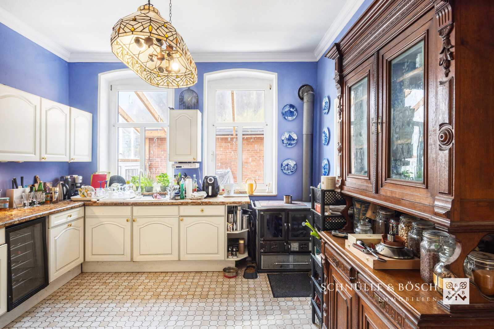 Im Erdgeschoss empfängt Sie ein beeindruckendes Wohnzimmer mit einem gemütlichen Kamin, während der klassische Ofen in der Miele Landhausküche eine warme und einladende Atmosphäre schafft. Mit einer imposanten Deckenhöhe von 3,30 m versprüht dieser Bereich ein großzügiges, herrschaftliches Ambiente. Ein Duschbad mit Wellnessdusche und einer Sauna für 4 Personen lädt zum Entspannen ein.