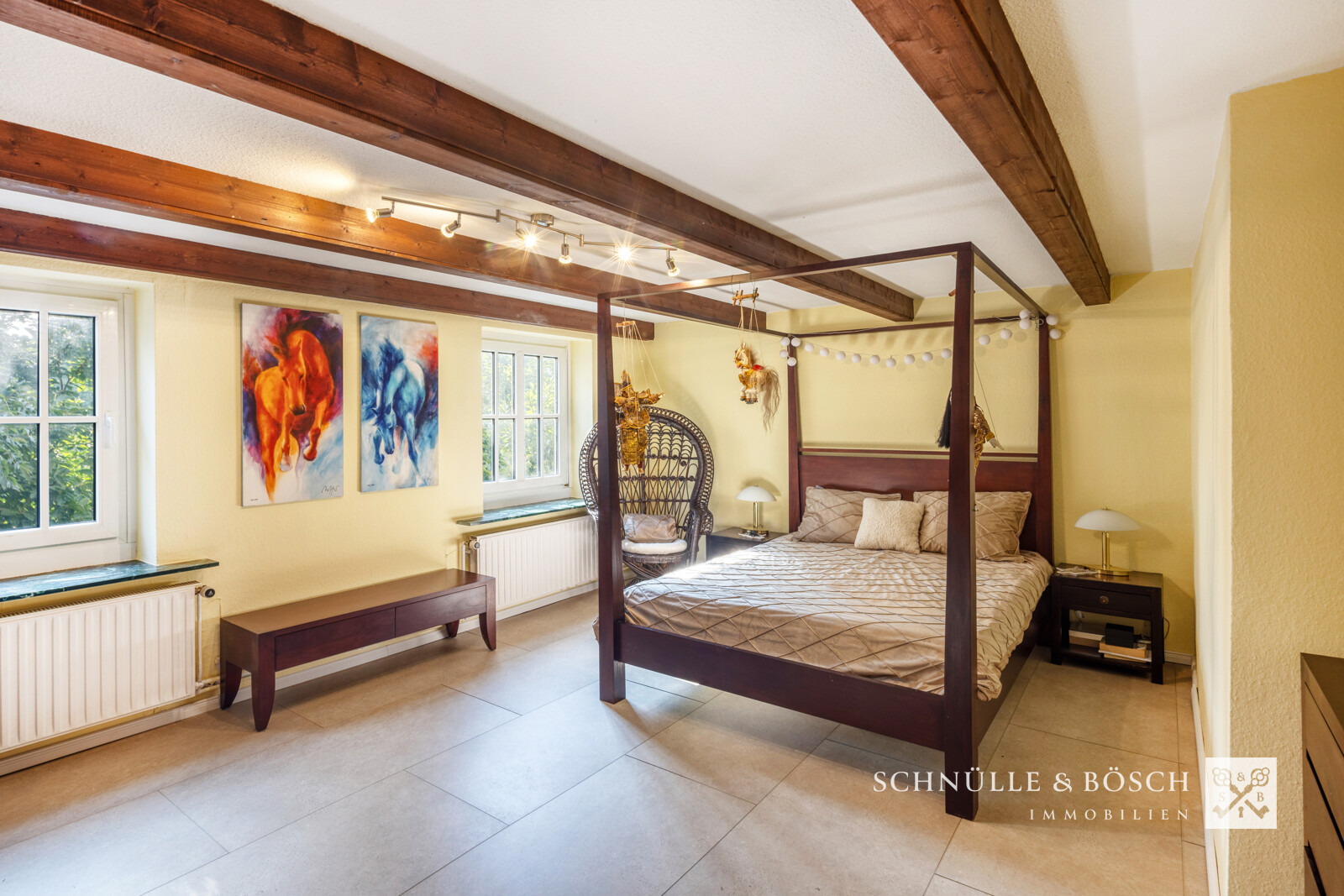 Das Dachgeschoss beherbergt ein modernes Badezimmer aus dem Jahr 2023 mit Badewanne. Ein rund 75 m² großer Keller bietet zusätzlichen Stauraum. Der unbeheizte Wintergarten mit ca. 36 m² am Haupthaus ist der ideale Ort, um die Natur bei jedem Wetter zu genießen.