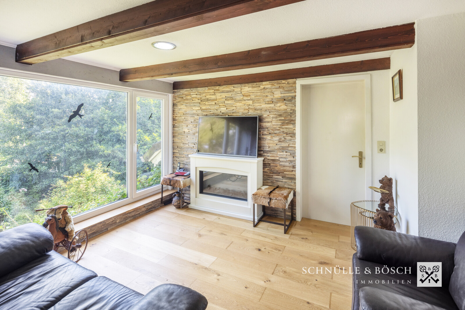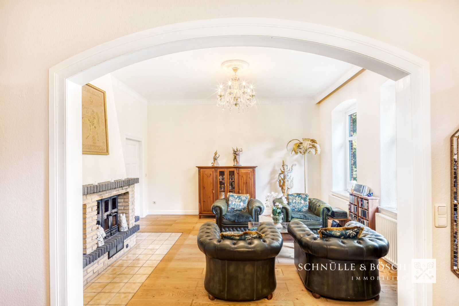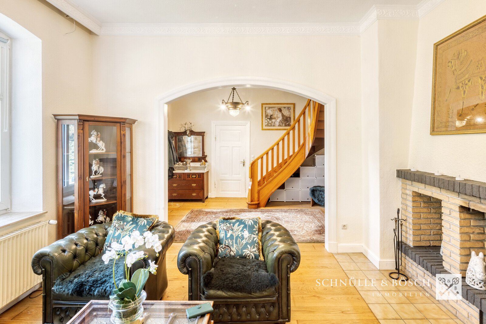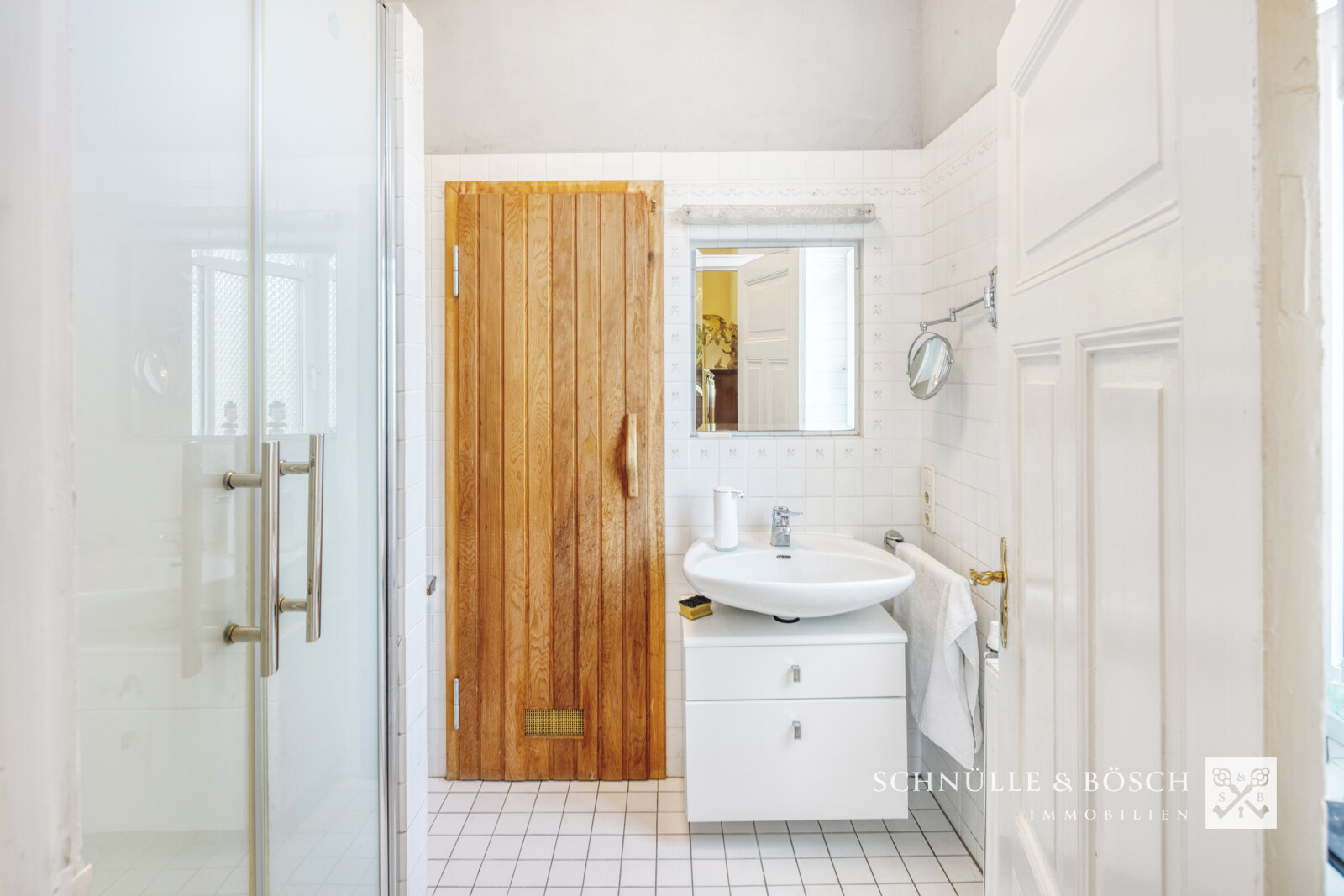 Im Erdgeschoss empfängt Sie ein beeindruckendes Wohnzimmer mit einem gemütlichen Kamin, während der klassische Ofen in der Miele Landhausküche eine warme und einladende Atmosphäre schafft. Mit einer imposanten Deckenhöhe von 3,30 m versprüht dieser Bereich ein großzügiges, herrschaftliches Ambiente. Ein Duschbad mit Wellnessdusche und einer Sauna für 4 Personen lädt zum Entspannen ein.