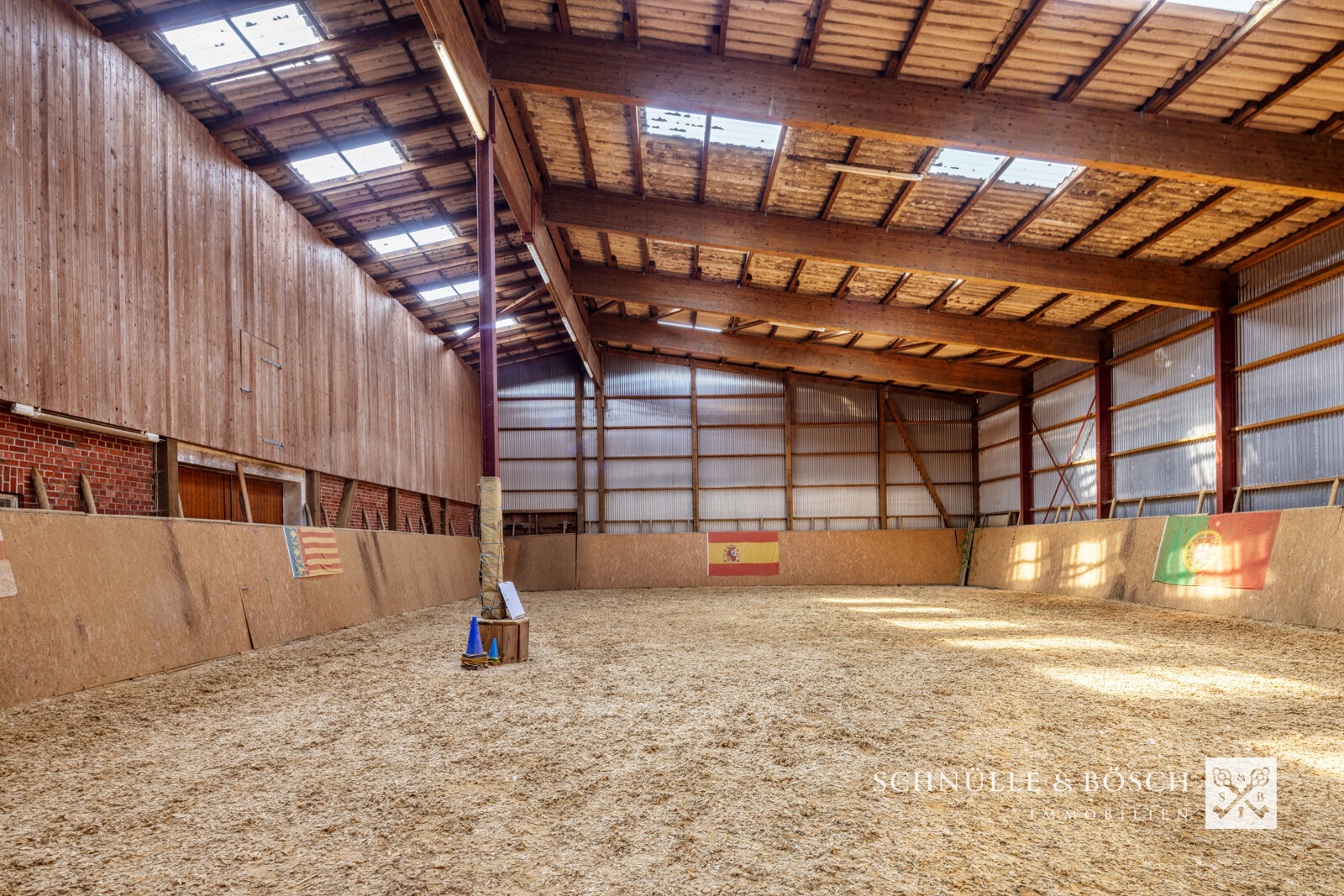 Eine weitere große Halle auf dem Grundstück beherbergt drei Einstellboxen und eine Doppelbox für Ihre Pferde. Die Reithalle von 14 x 25 m ist perfekt für das tägliche Training. Ein großer Lagerraum in der Halle, eine Garage sowie ein separates Büro mit Bad- und Küchenanschlüssen und ein zusätzlicher Raum, der erfolgreich für die Hundezucht genutzt wurde, runden das Angebot ab.