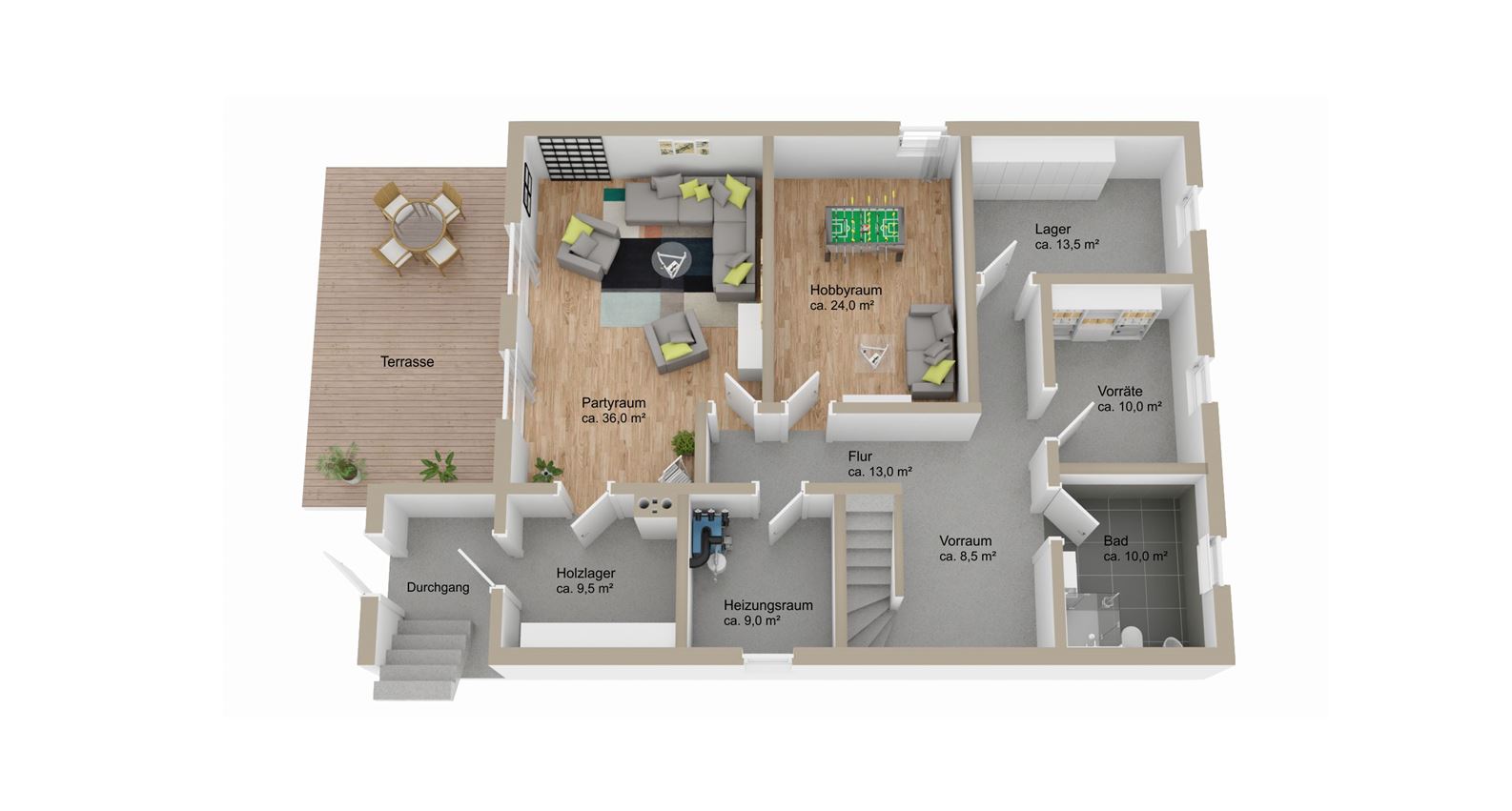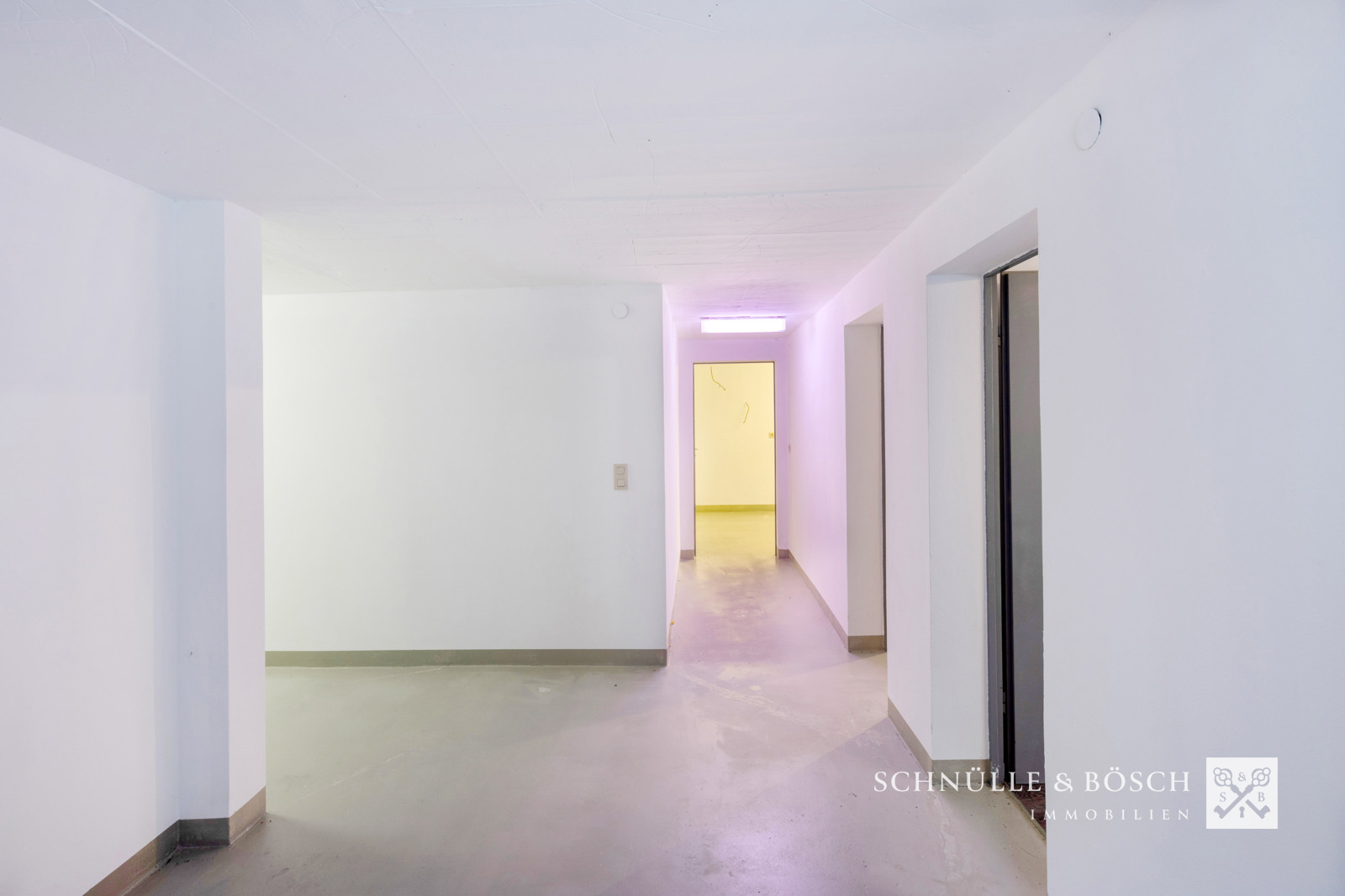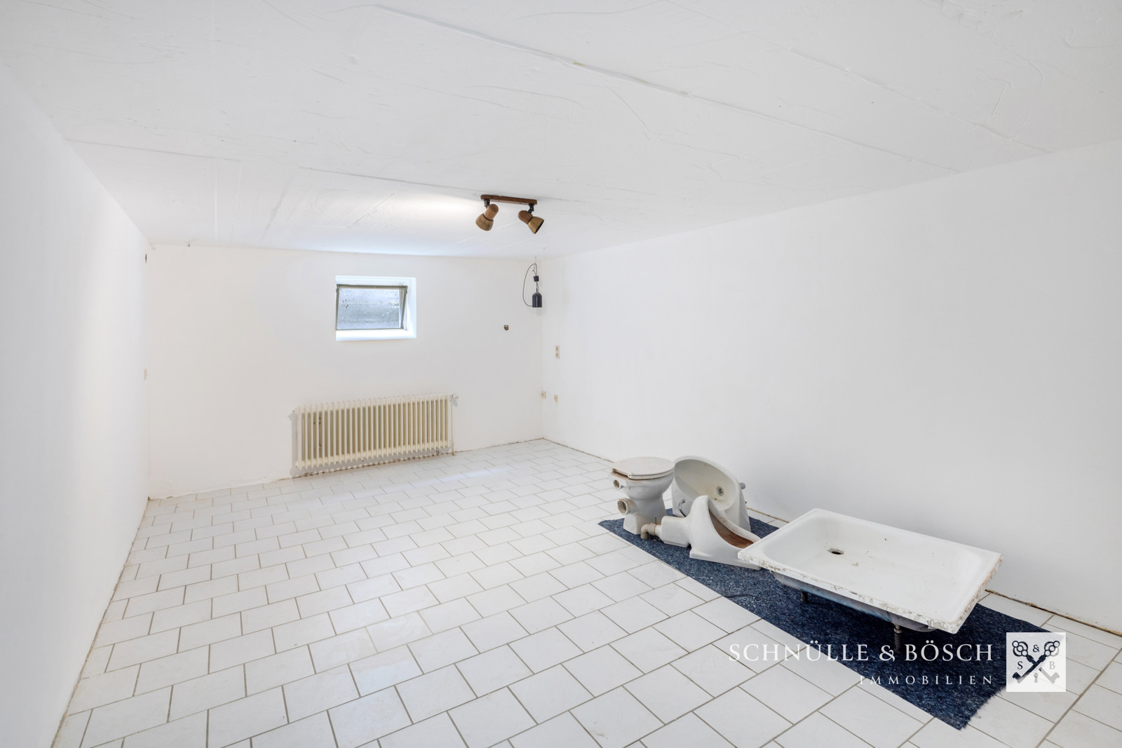 Vom Flur aus geht es auch in den Keller. Das Haus ist vollständig unterkellert und durch die leichte Hanglage erhält dieser Bereich auf der Ostseite viel Tageslicht. Der Keller mit seinen knapp 132 m² bietet ausreichend Platz für Hobbys, Fitnessraum, Spielzimmer und weiteren Stauraum. Mit einem eigenen Außenzugang können Sie sich direkt nach der Gartenarbeit im Keller umziehen und der Schmutz bleibt außerhalb des Wohnbereiches. Auch für eine Werkstatt, einen Partyraum oder die Carrera-Bahn ist hier Platz.