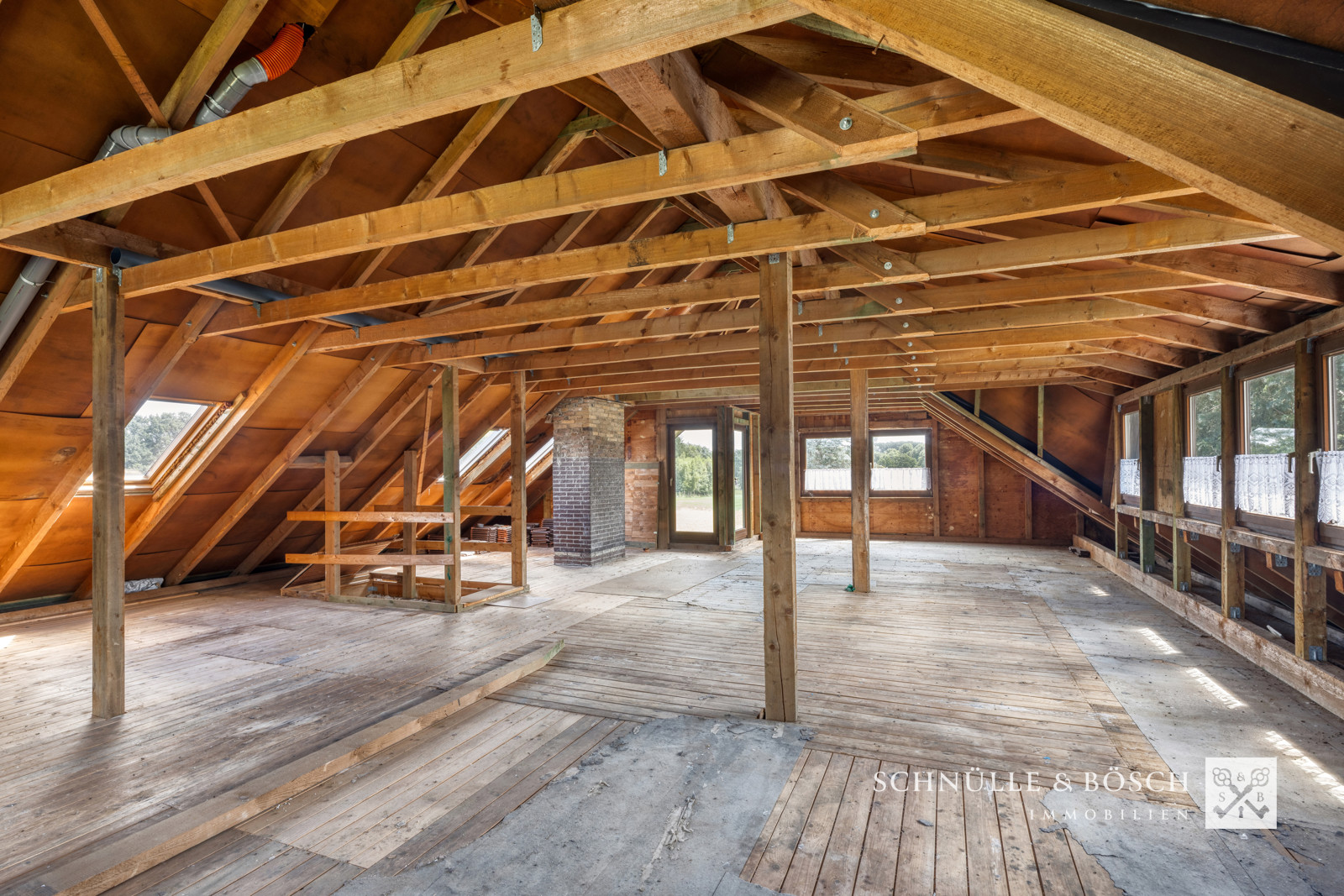 Vom Eingangsbereich im Erdgeschoss geht es weiter ins Dachgeschoss, denn hier wartet viel Platz auf Sie und Ihre Familie. Das Haus ist als Flachdach erbaut worden und hat Anfang der 90iger Jahre ein Krüppelwalmdach erhalten. Dieser Bereich steht Ihnen als Ausbaufläche direkt zur Verfügung. Von der Loggia aus haben Sie einen schönen Blick über die Felder bis hin zum Vörder See - ein echter Ort zum Entspannen.
