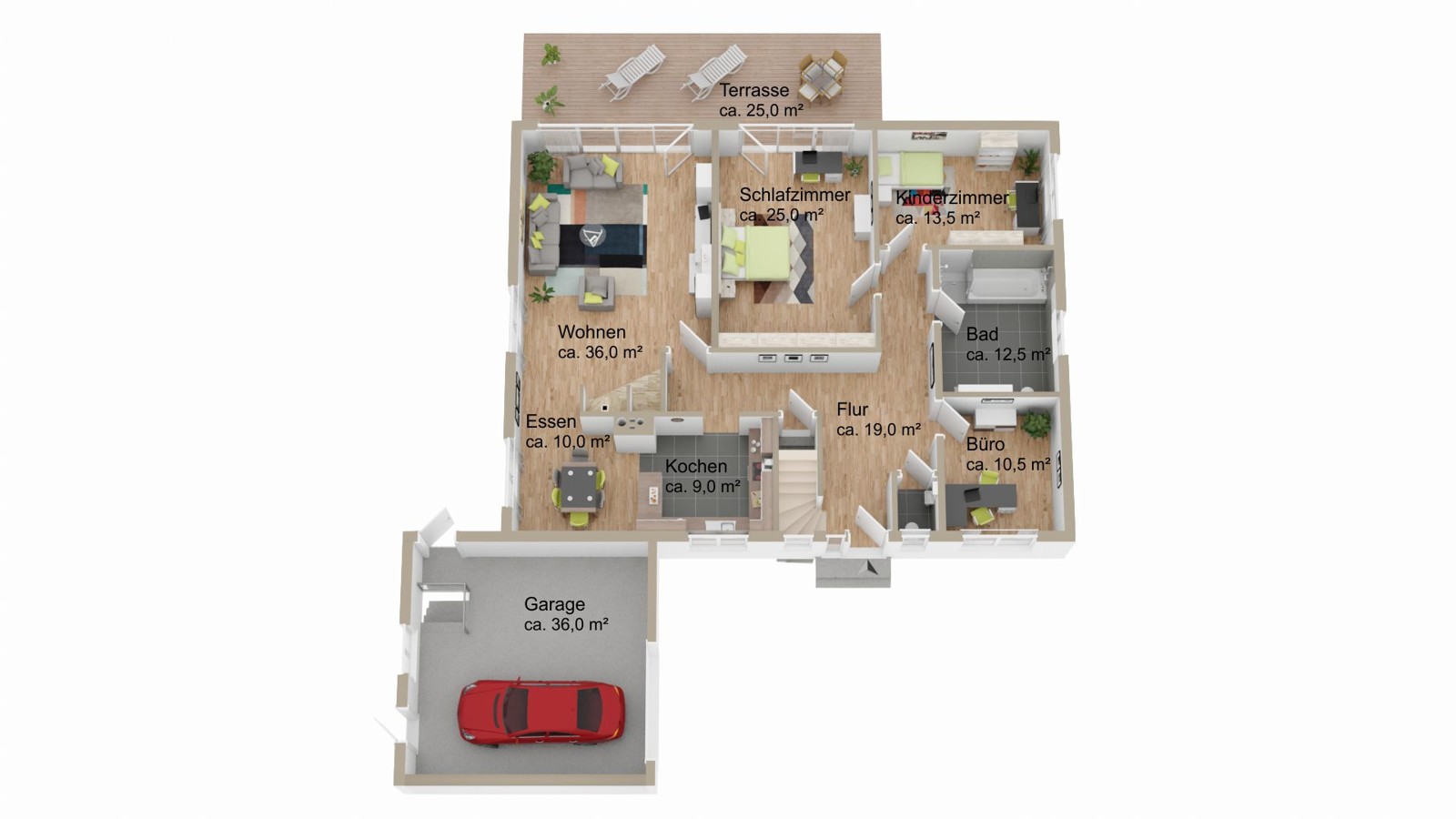Aber nicht nur das Haus, auch das Grundstück und der Garten gönnt Ihnen und Ihrer Familie viel Raum für neue Ideen. Eine Garage gehört genauso dazu wie zwei weitere Außenstellplätze.