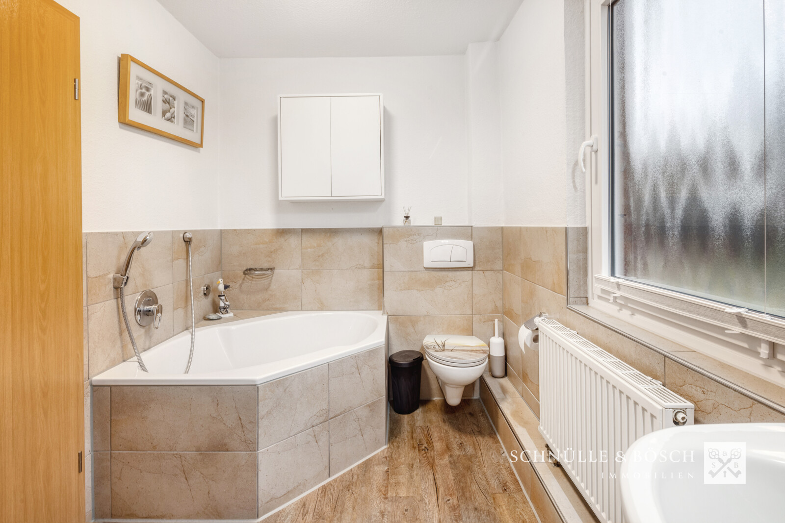 Weiter finden Sie hier den Zugang zum Obergeschoss. Ein Bereich der aktuell den Kindern gehört und der über drei Zimmer, eine gemütliche Schlafnische und ein Badezimmer mit Wanne und Dusche verfügt. Die Räume können auch als Gästezimmer oder Home-Office-Bereich genutzt werden. Aufgrund der Dachform haben Sie im Obergeschoss keine Dachschrägen in der Zimmern, was das Stellen der Möbel deutlich erleichtert.