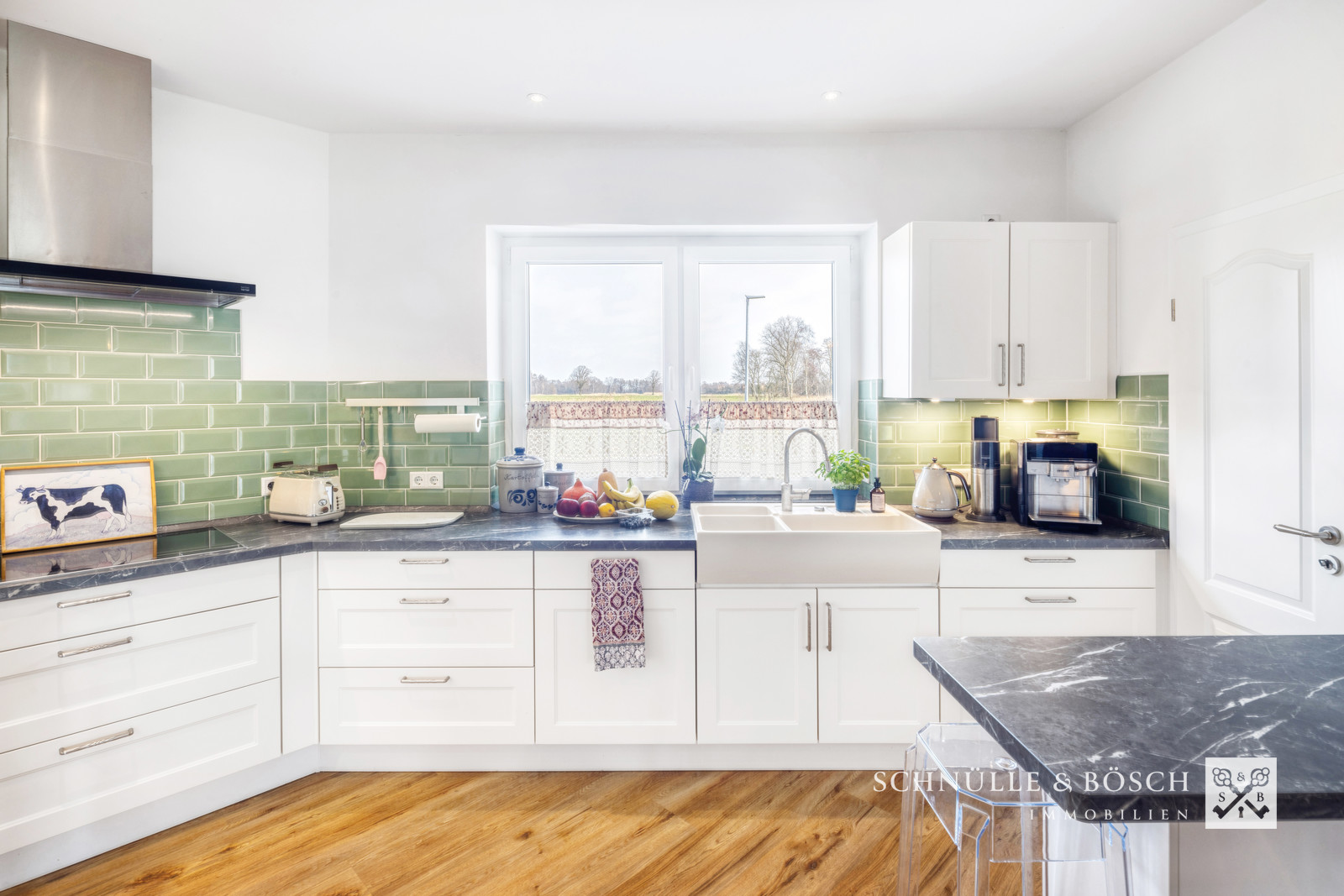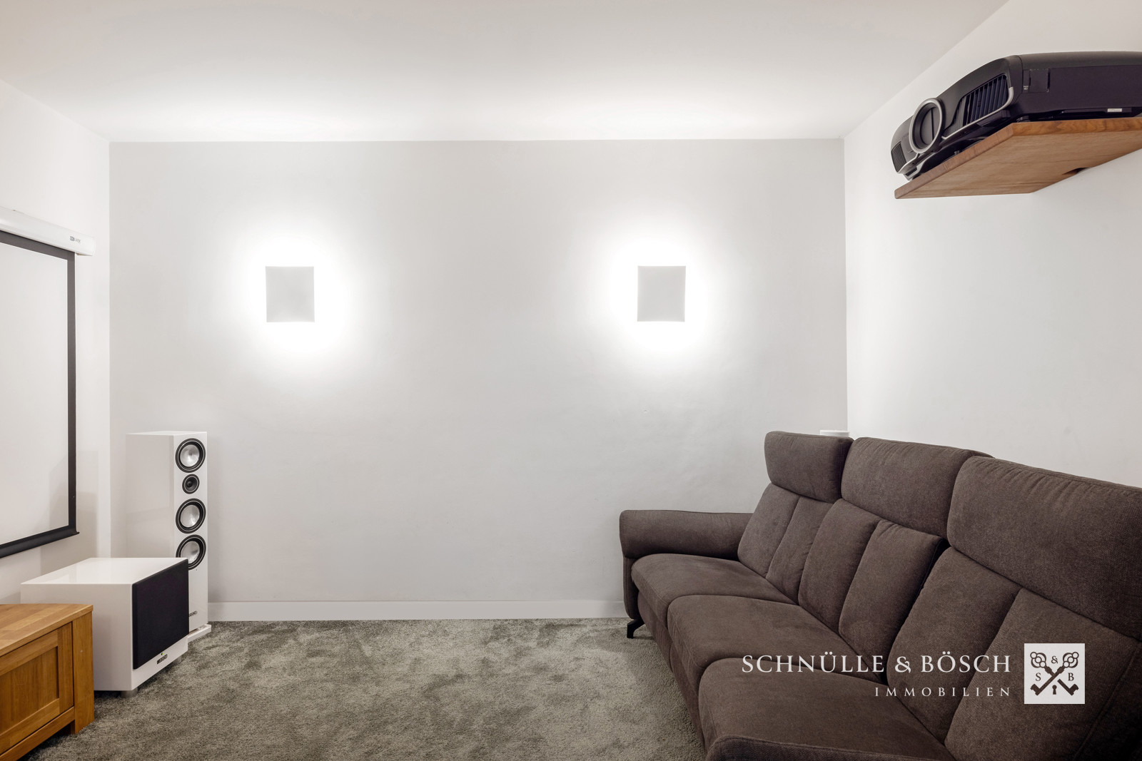 Durchdacht ist auch der angrenzende Raum mit dem eingebauten Kino, welches zu gemeinsamen Stunden einlädt. Die offene Küche ist mit Markengeräten ausgestattet und bildet mit der Speisekammer ein makelloses Zusammenspiel. Die große Fensterfront des Wohnzimmers schafft einen tollen Blick auf die überdachte Terrasse und den schönen Garten und rundet diesen großen Wohn- und Lebensraum ab.
