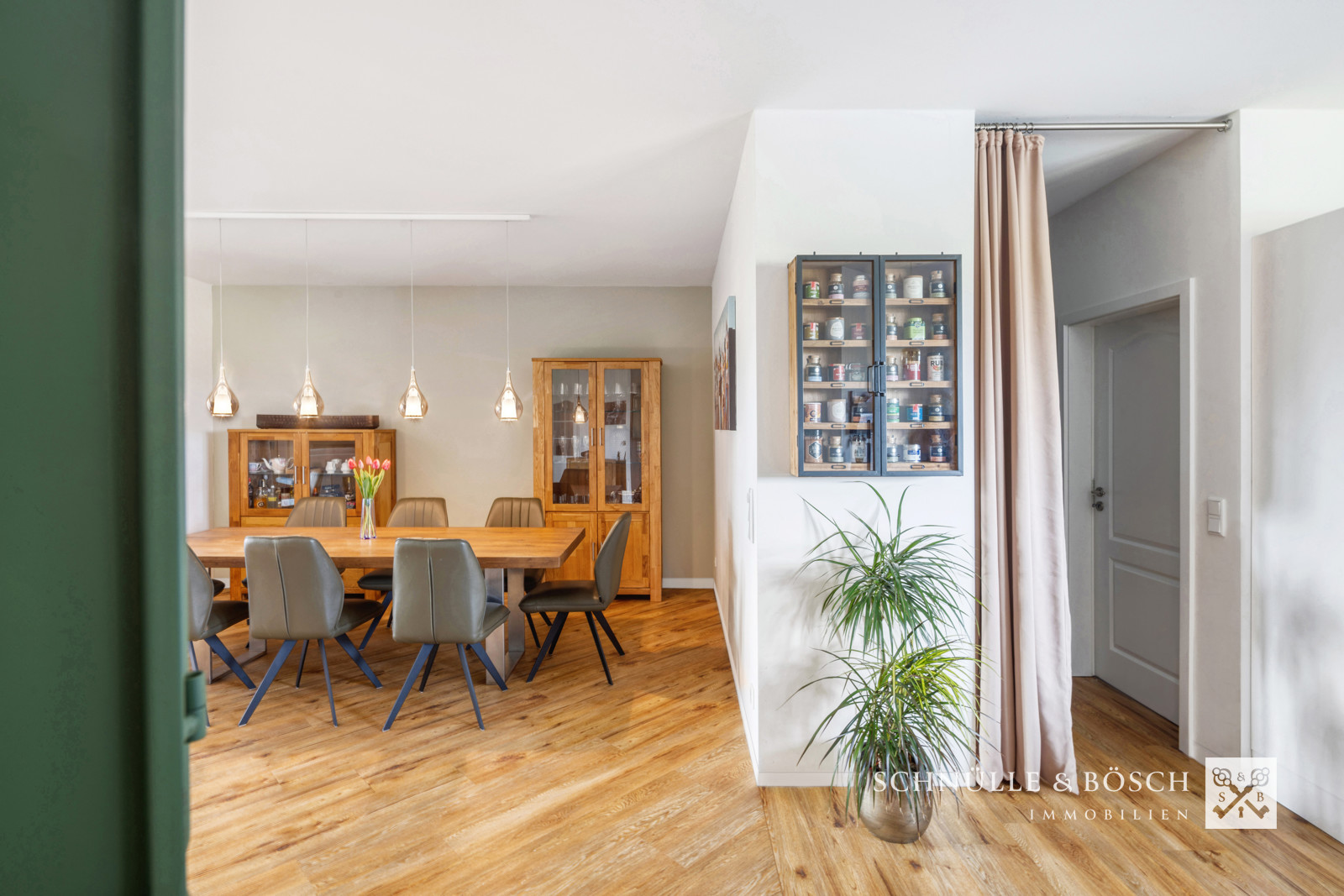 Ebenerdig gelangen Sie in den hellen Eingangsbereich, wo Sie durch die zwei Flügeltüren mit Glaseinsatz bereits bis in den Garten schauen können. Die hohen Decken schaffen ein ganz besonderes Ambiente! Sie begehen direkt das großzügige Wohn- und Esszimmer, welches das Herz dieses Hauses bildet. Hier treffen sich Familie und Freunde zu entspannten Abenden und der Kamin schafft dazu die perfekte Atmosphäre.