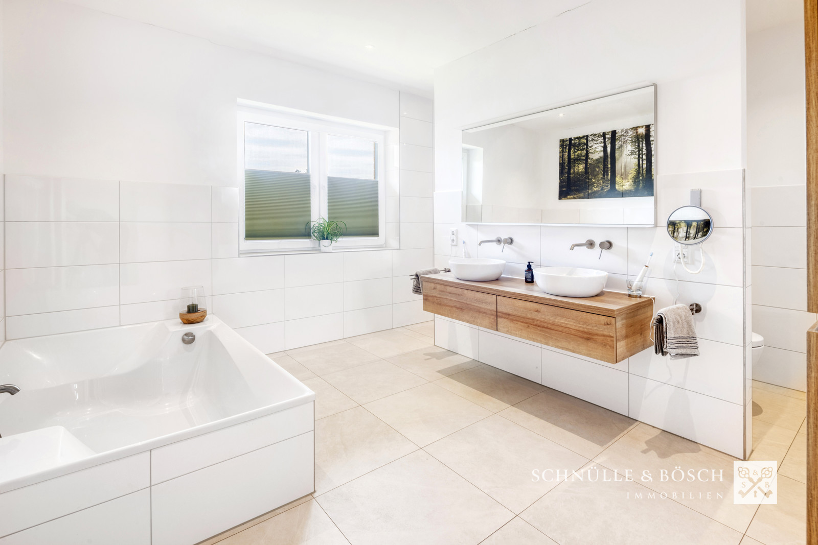 Schauen wir nun gemeinsam in den aktuellen Elternbereich des Hauses. Hier finden Sie ein helles Schlafzimmer, ein Ankleidezimmer, einen Abstellraum und ein Badezimmer, das keine Wünsche offen lässt. Eine große Badewanne für zwei Personen, die ebenerdige Dusche sowie das WC und die beiden Waschbecken runden diesen Bereich ab.