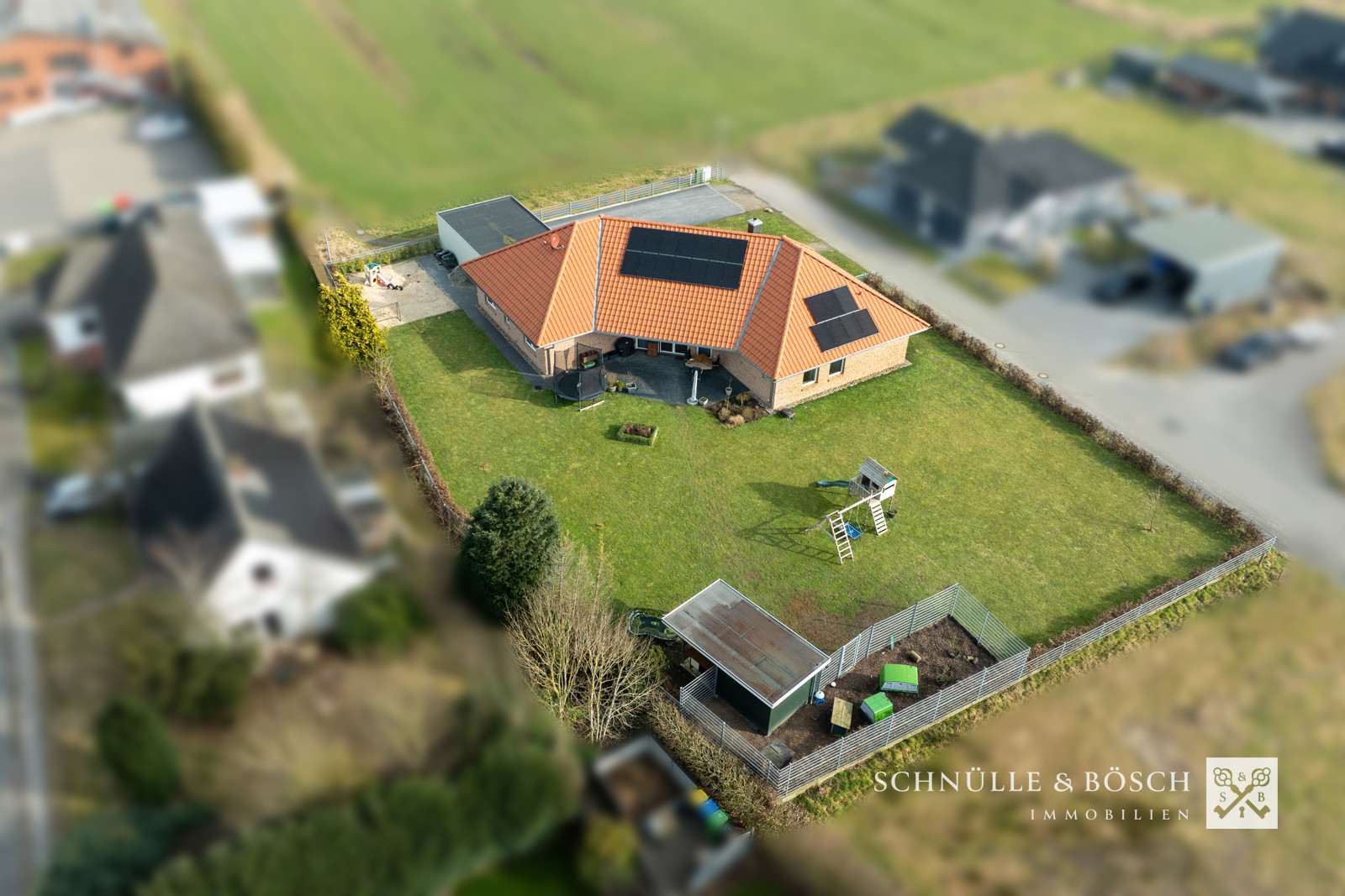 Und nun lassen Sie uns unbedingt über den Garten sprechen! Das Grundstück umfasst eine Fläche von 1.850 m² und schafft hier für alle Familienmitglieder hinreichend Platz für individuelle Pläne. In der Doppelgarage mit elektrischen Toren können Sie eine kleine Werkstatt einrichten. Über den Hauswirtschaftsraum gelangen Sie von der Garage direkt in Haus. Auf dem Grundstück sind zurzeit ein Hühnerstall und ein Gartenhaus sowie Spielgeräte für die Kinder vorhanden.