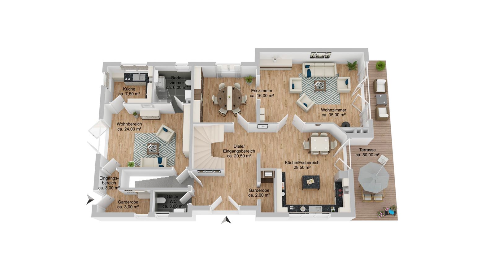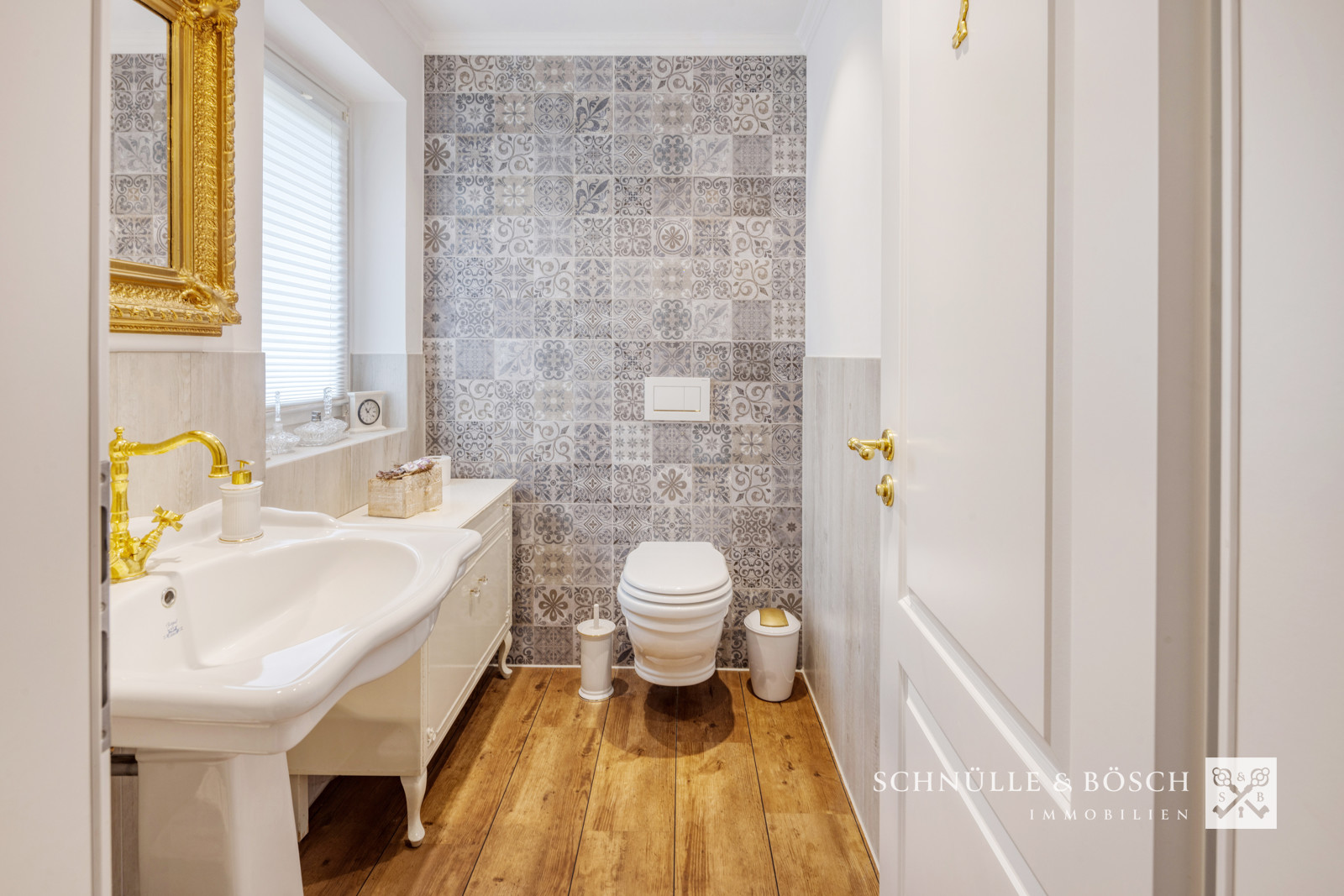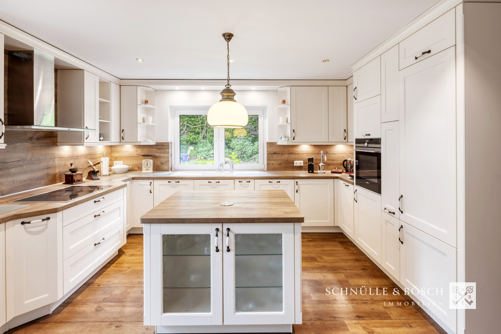 Sie erreichen den blickdichten Garten durch eine der zwei Zugangstüren oder über die Doppelgarage, in der auch Ihre E-Fahrzeuge direkt geladen werden könnte. Sie und Ihre Gäste werden von dem charmanten Kapitänsgiebel begrüßt und gelangen ebenerdig durch die Doppelflügeltür in die einladende Diele des Erdgeschosses. Hier befinden Sie im Mittelpunkt des Hause, denn von hier aus erreichen Sie über die wunderschöne Vollholztreppe die anderen Stockwerke und haben auch einen Zugang zur Einliegerwohnung. Im Erdgeschoss wurde bei der Sanierung 2017 viel Wert auf das Zusammenspiel aus alten Elementen und neuen Ideen gelegt. In der offenen Küche, die mit einer modernen Kücheninsel ausgestattet ist, befindet sich auch ein Essplatz für bis zu sechs Personen. Von hier aus können Sie direkt auf die knapp 50m² große und überdachte Terrasse gelangen. Sie haben also die Wahl, ob Sie im Haus oder doch lieber draußen in Ihrem Garten mit Blick auf das Teehaus und das Wasserspiel frühstücken möchten. Neben der Küche liegt das Wohnzimmer, welches durch eine Schiebetür mit dem Esszimmer verbunden ist. Der Kamin im Wohnzimmer lädt zu gemütlichen Abenden ein. Die Garderobe und das Gäste-WC runden diese Etage ab.