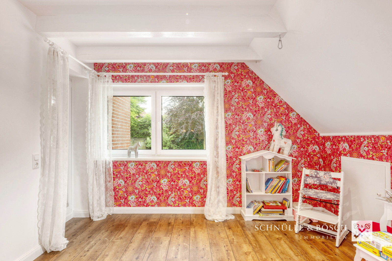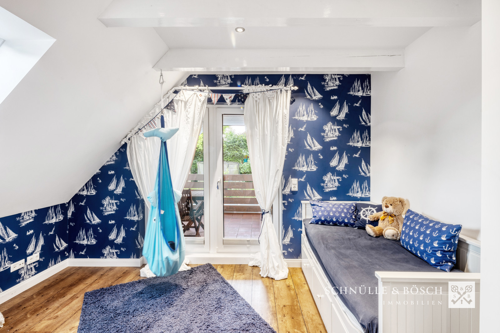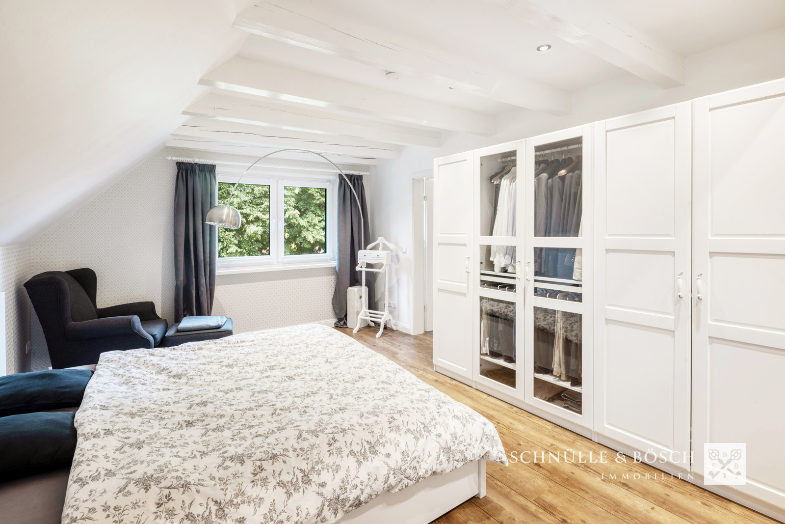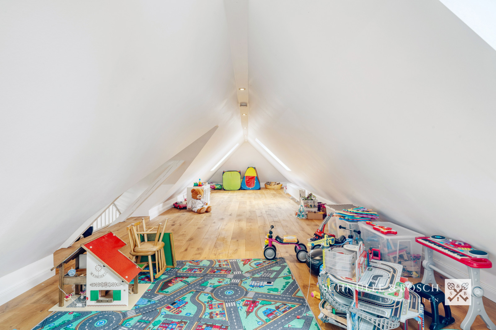 Im Obergeschoss befinden sich die Privaträumen. Hier haben die Eigentümer besonderen Geschmack bewiesen und die stilvolle Kombination aus alten und neuen Elementen schaffen bereits in der offenen Galerie eine elegante Atmosphäre. Das großzügige Schlafzimmer mit einem Bad en Suite und der Möglichkeit von hier aus, die Alarmanlage zu betätigen, schaffen nicht nur Wohlfühlträume sondern sorgen auch für Sicherheit. Weiter finden Sie auf dieser Etage zwei Kinderzimmer, wobei beide Zimmer über einen direkten Zugang zur Loggia verfügen und so auch die Kinder ihren eigenen Außenbereich mit Blick in den Garten genießen. Das Kinderbad und ein Ankleidezimmer komplettieren dieses Stockwerk. Aber das war noch nicht alles, dann für die Kinder ist auch der Spitzboden gedämmt und zum Spiel-Paradies ausgebaut worden.
