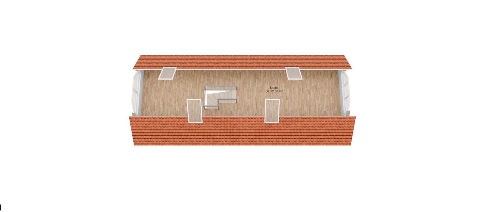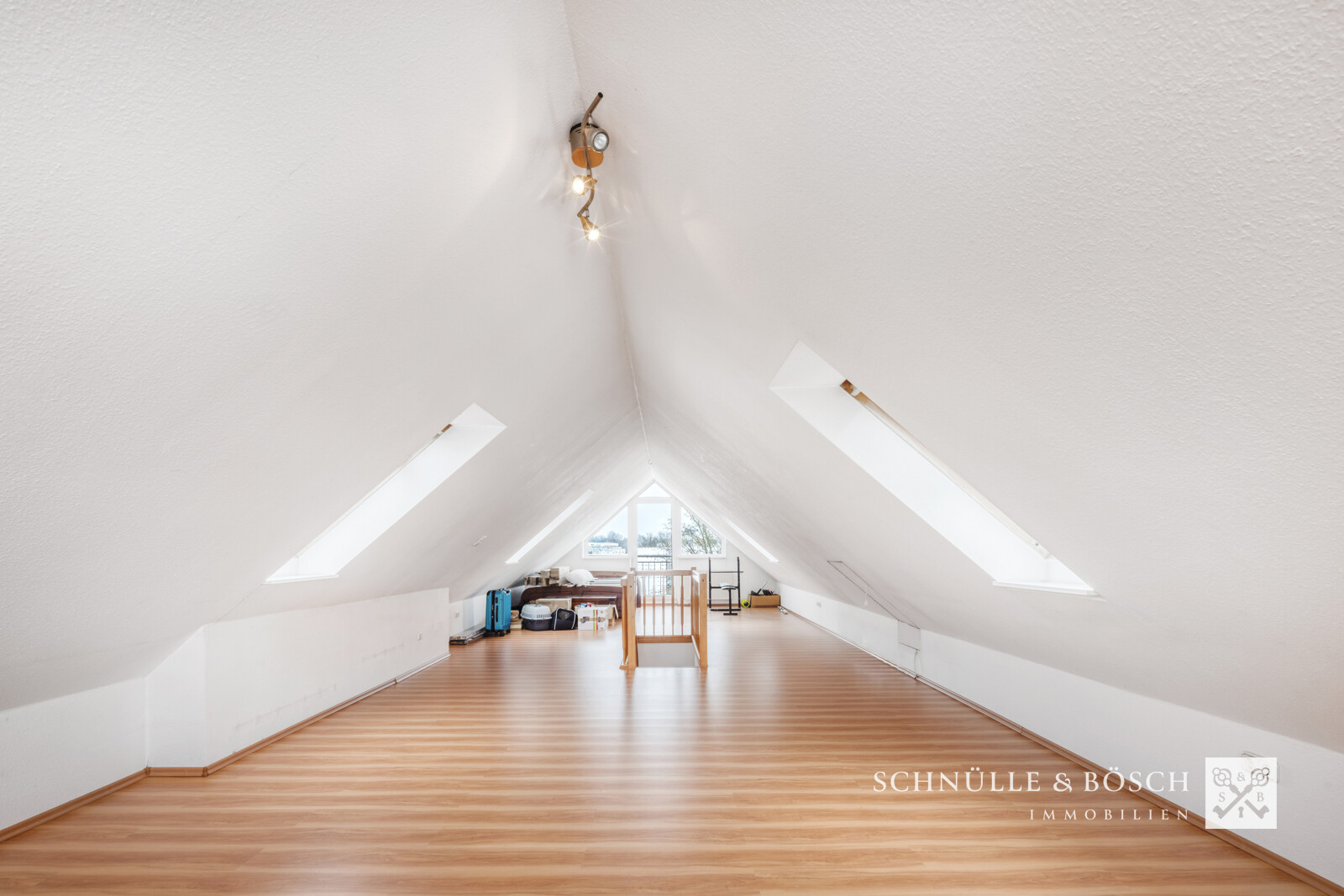 Vom Flur aus nehmen Sie die Treppe in das obenliegende Studio. Hier können Sie Ihrer Fantasie freien Lauf lassen, ob als Hobbyraum, Atelier oder Home-Office Bereich. Alternativ erschaffen Sie mit einer Wand zwei neue Räume - dank der zahlreichen Fenster ist hier oben vieles möglich.