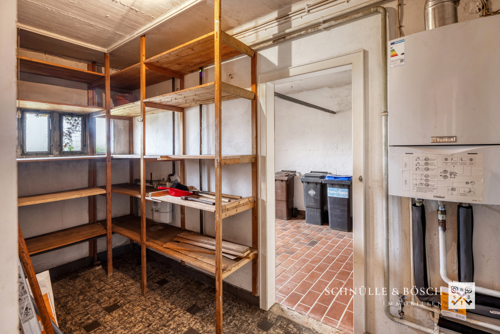 Die ehemalige Garage des Hauses ist von den Eigentümer als Hauswirtschaftsraum umgenutzt worden, denn zu diesem Haus gehört eine weitere Garage auf dem Garagenhof ca. 20m vom Haus entfernt. Hier haben Sie ausreichend Stellfläche für Ihr Auto oder andere Fahrzeuge. Daher steht die Garage im Haus zurzeit als Abstellfläche für Fahrräder, Gartengeräte oder ähnlichem zur Verfügung.