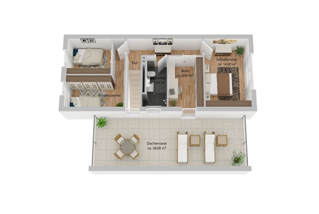 Im Dachgeschoss sind drei weitere Zimmer untergebracht, die als Schlafzimmer, Büro, Kinder- oder Gästezimmer genutzt werden können. Besonders hervorzuheben ist der direkte Zugang zur Dachterrasse, die entspannte Stunden ganz ohne Blicke der Nachbarn verspricht.