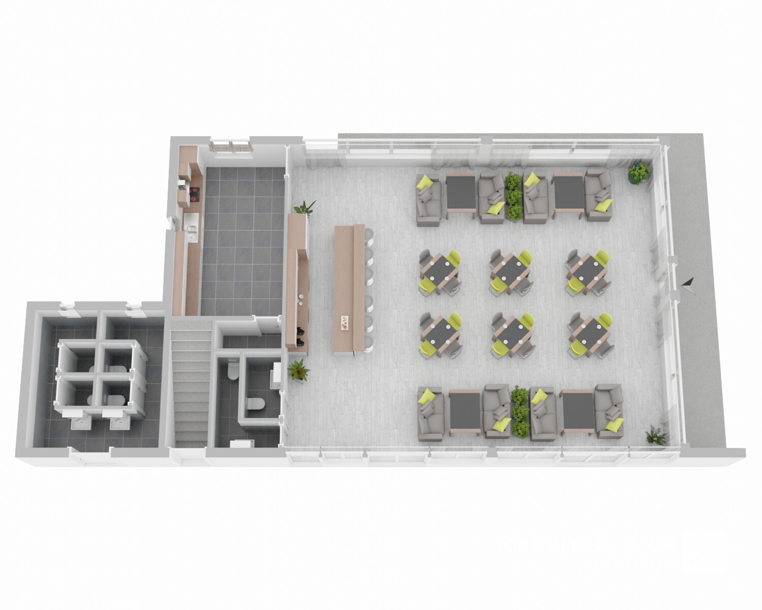 - Ebene zur Straße: Gastraum mit Bar und Küche u. zwei Gäste-WC's
