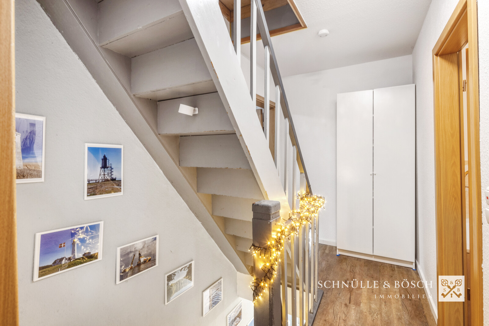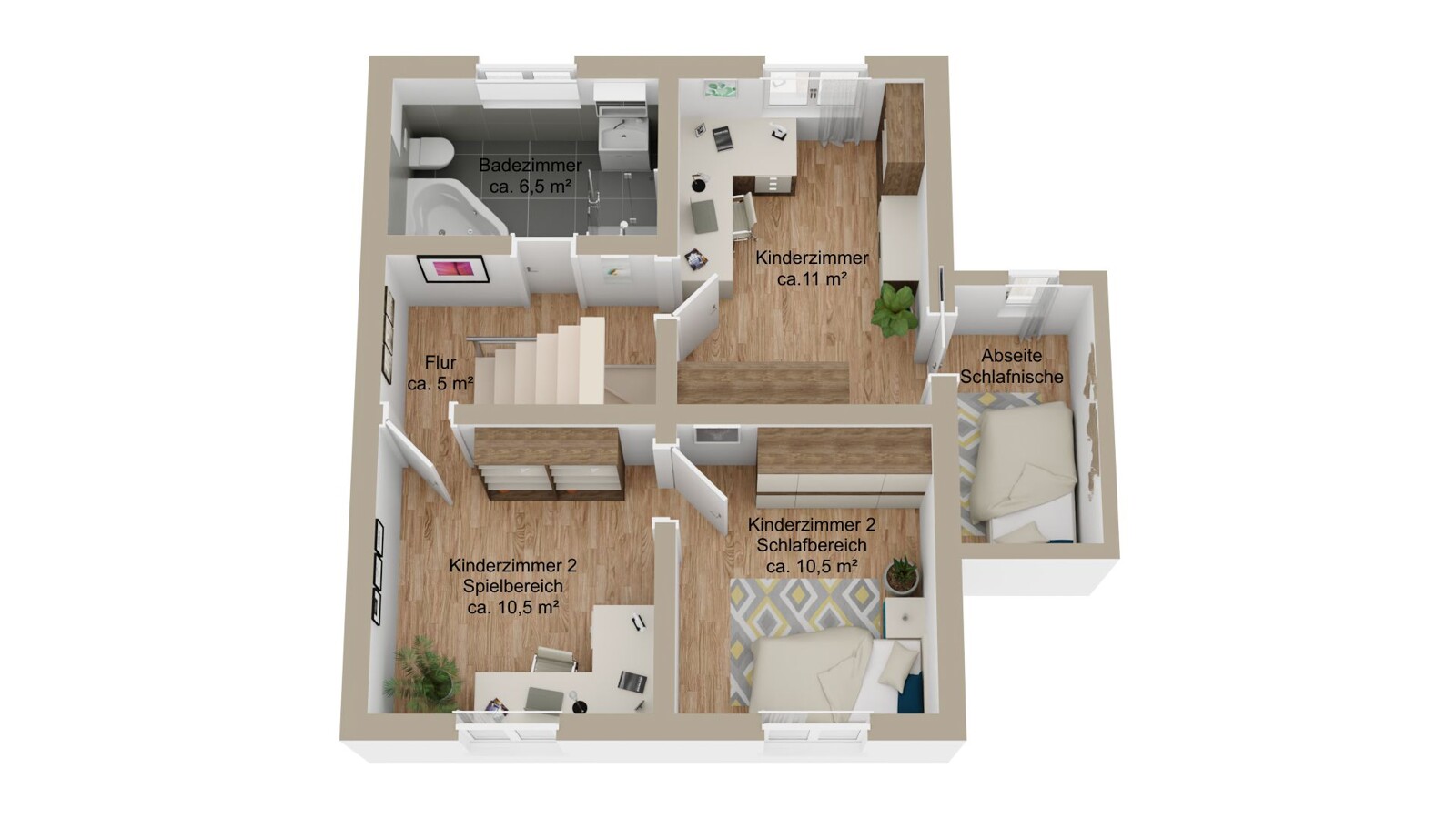 Weiter finden Sie hier den Zugang zum Obergeschoss. Ein Bereich der aktuell den Kindern gehört und der über drei Zimmer, eine gemütliche Schlafnische und ein Badezimmer mit Wanne und Dusche verfügt. Die Räume können auch als Gästezimmer oder Home-Office-Bereich genutzt werden. Aufgrund der Dachform haben Sie im Obergeschoss keine Dachschrägen in der Zimmern, was das Stellen der Möbel deutlich erleichtert.