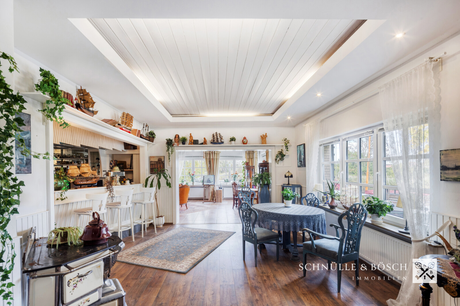 Seien Sie also herzlich Willkommen! Über eine, aus alten Ziegeln gefertigte Treppe, gelangen Sie zur Eingangstür des Hauses, die durch einen Windfang geschützt ist. Von hier aus treten Sie ein in das helle und freundliche Esszimmer mit dem ehemaligen Tresen, der bis heute erhalten wurde. Das Wohnzimmer schließt direkt an das Esszimmer an und der Blick aus jedem Fenster lässt das maritime Herz höher schlagen. Sie finden im Erdgeschoss zwei Badezimmer, ein Schlafzimmer mit Ankleide, ein separates Gästezimmer mit WC und eigenem Außenzugang, sowie die wundervolle Küche, die eine perfekte Kombination aus Nostalgie und Praktikabilität bildet.