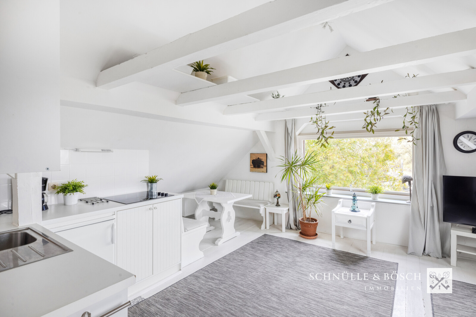 Das Dachgeschoss ist über eine helle Holztreppe zu erreichen. Im Dachgeschoss befindet sich ein weiterer Wohn- und Essbereich, sowie ein Badezimmer mit Dusche und ein Schlafzimmer. Auch im Dachgeschoss ist der Blick aus dem Fenster zu jeder Tageszeit etwas ganz besonders. Ob Sie die Tide beobachten, die großen Schiffe auf der Elbe oder die Zugvögel auf den Wiesen von Krautsand - hier spüren Sie das Leben am Wasser.