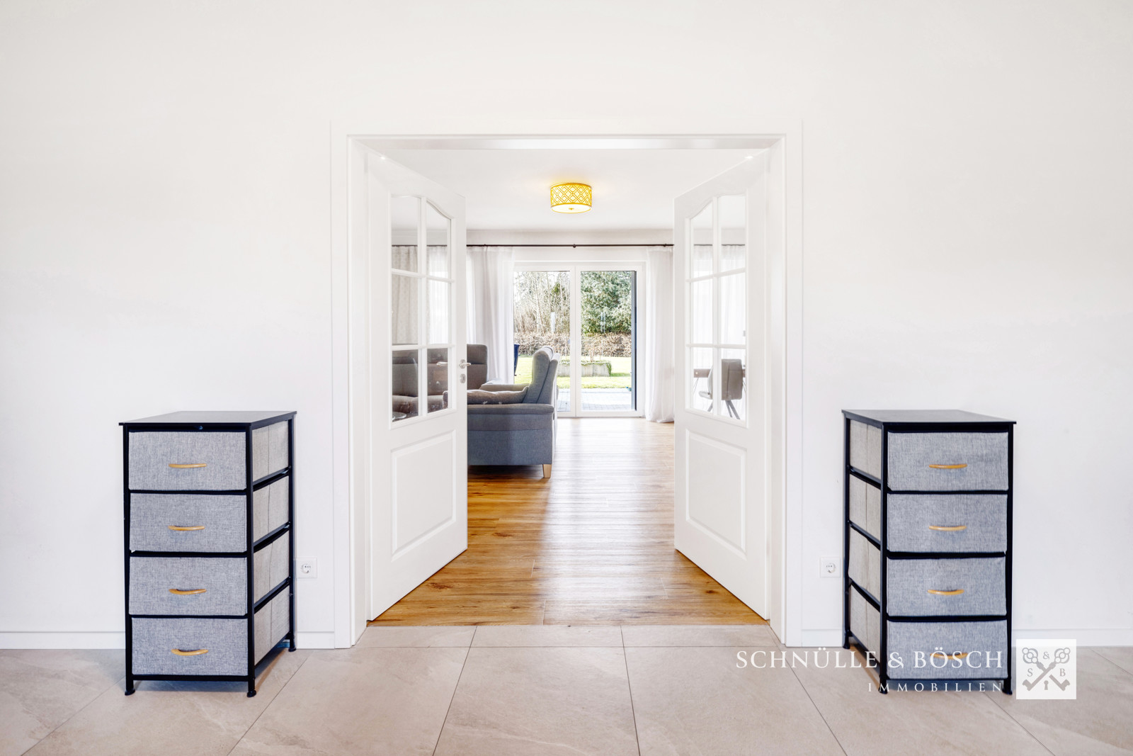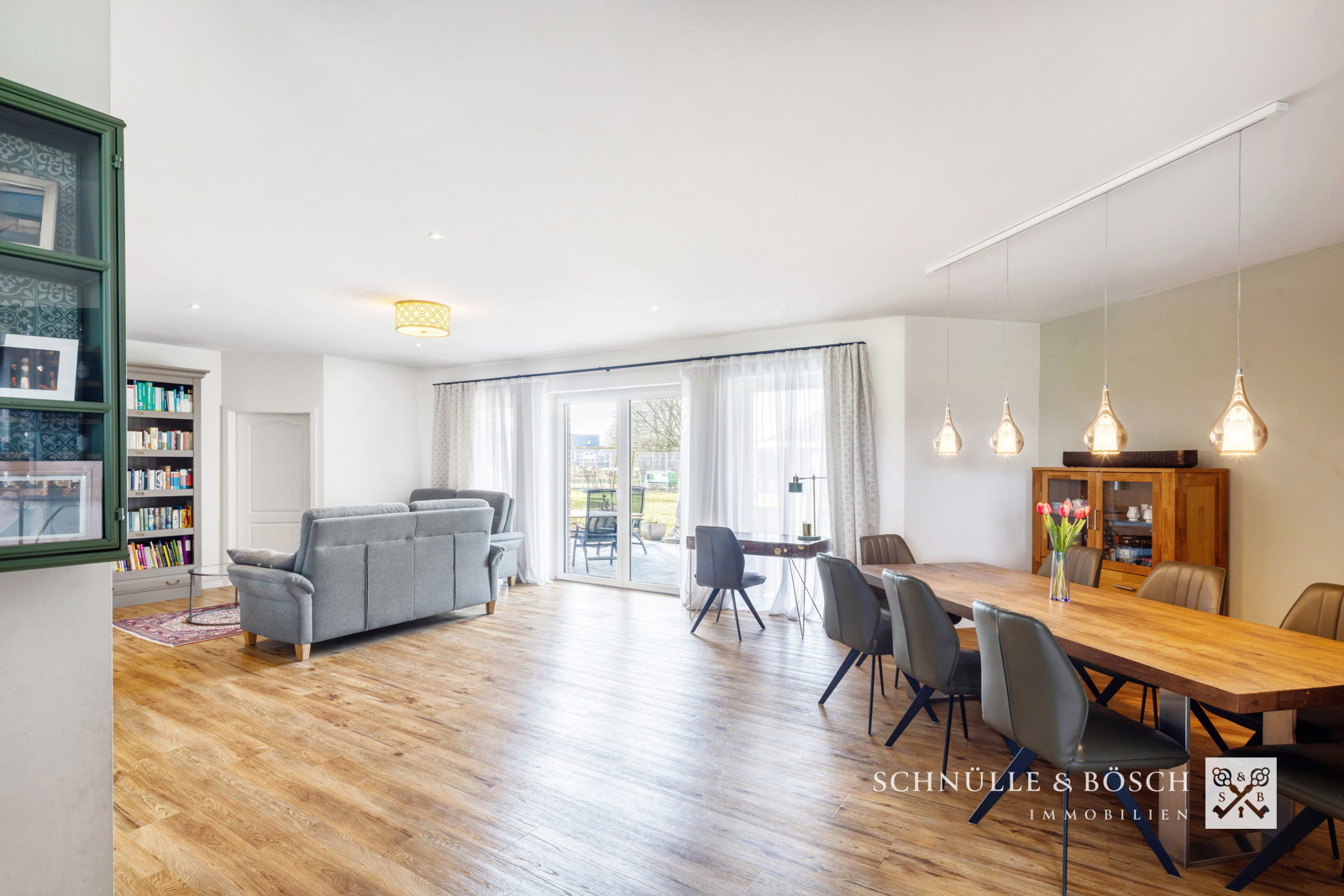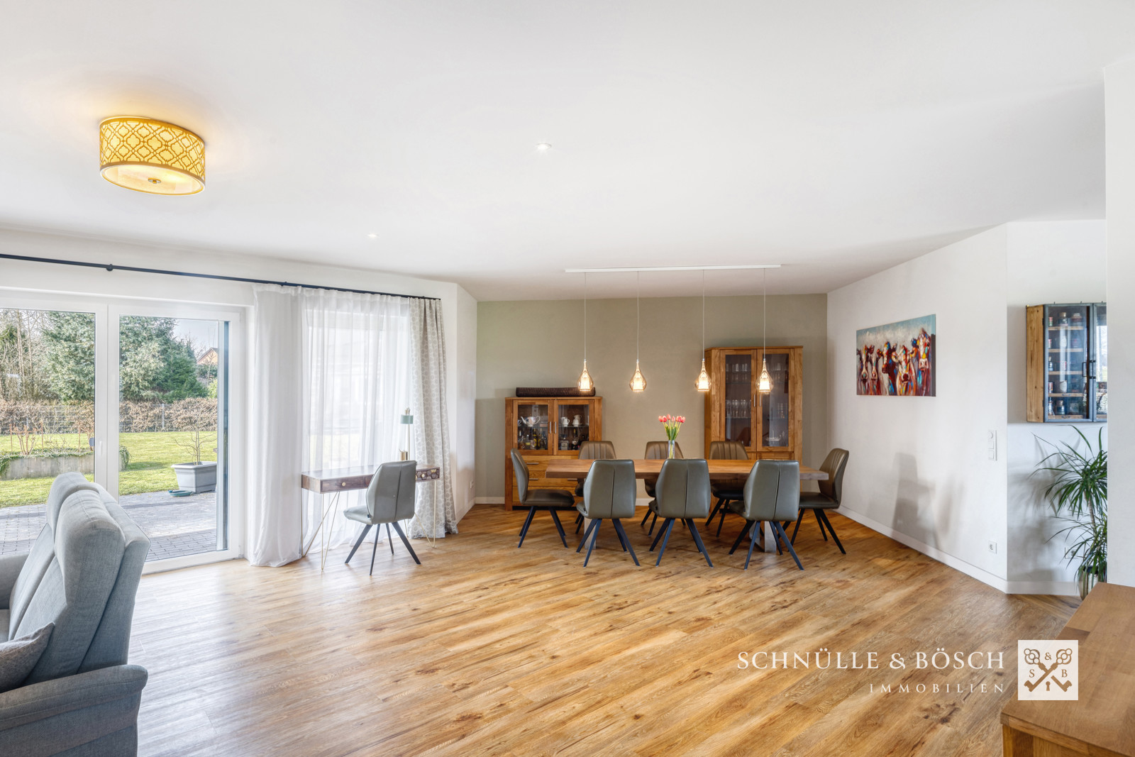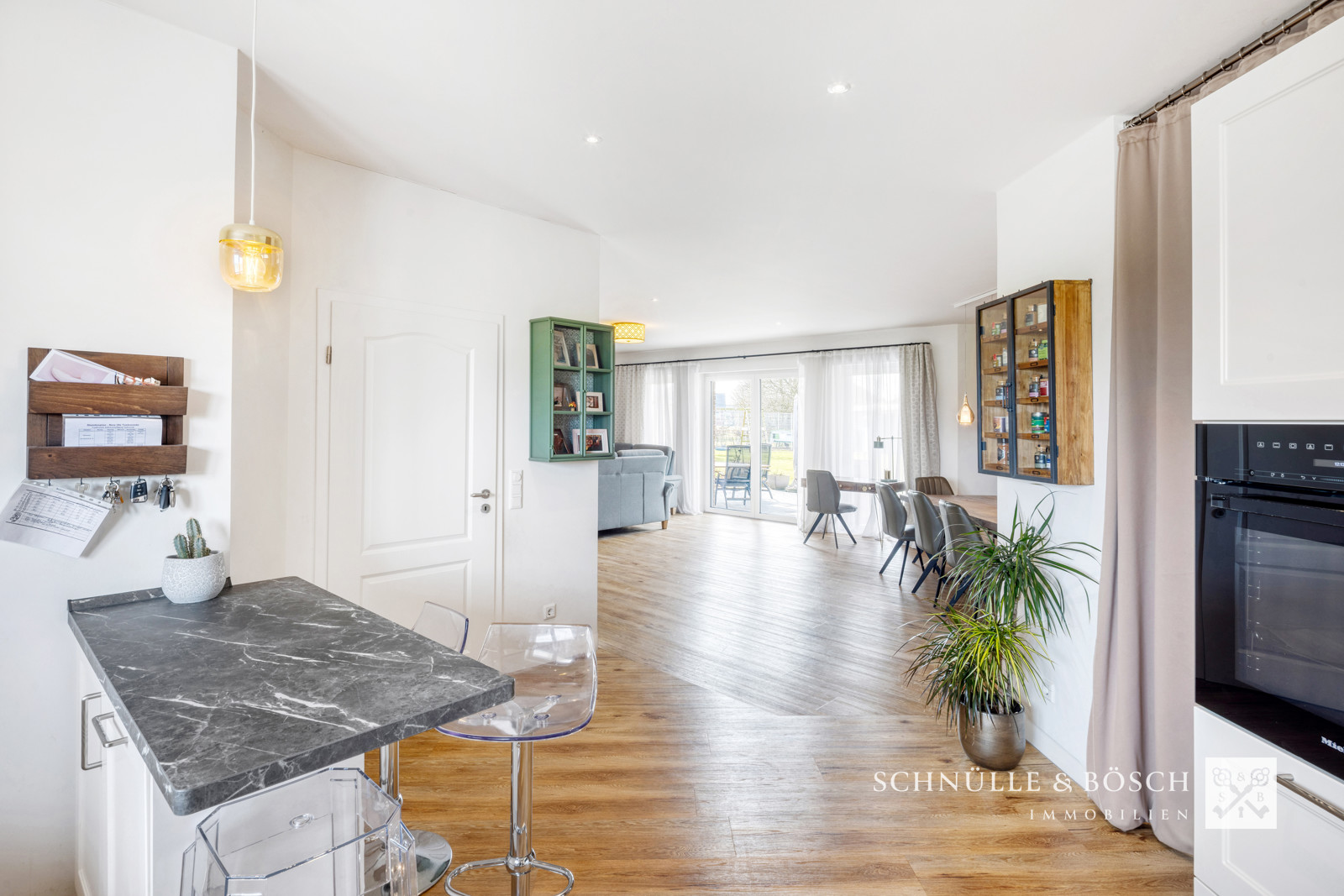 Durchdacht ist auch der angrenzende Raum mit dem eingebauten Kino, welches zu gemeinsamen Stunden einlädt. Die offene Küche ist mit Markengeräten ausgestattet und bildet mit der Speisekammer ein makelloses Zusammenspiel. Die große Fensterfront des Wohnzimmers schafft einen tollen Blick auf die überdachte Terrasse und den schönen Garten und rundet diesen großen Wohn- und Lebensraum ab.