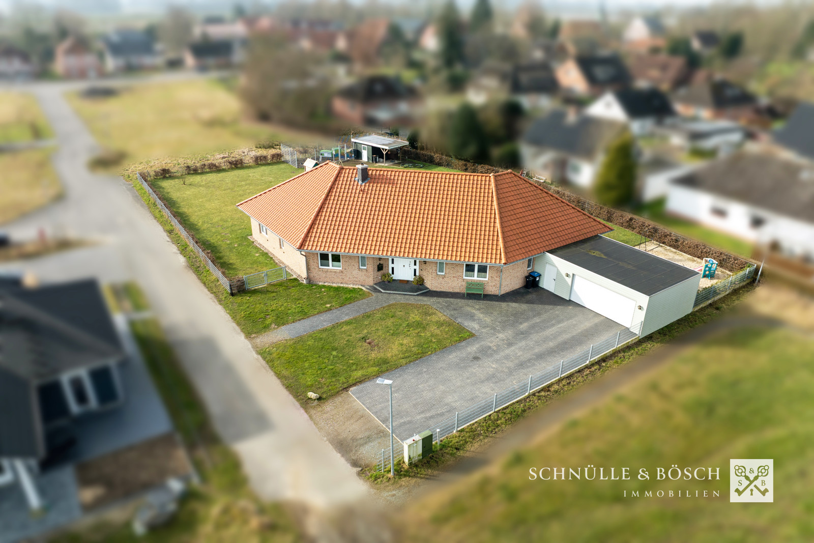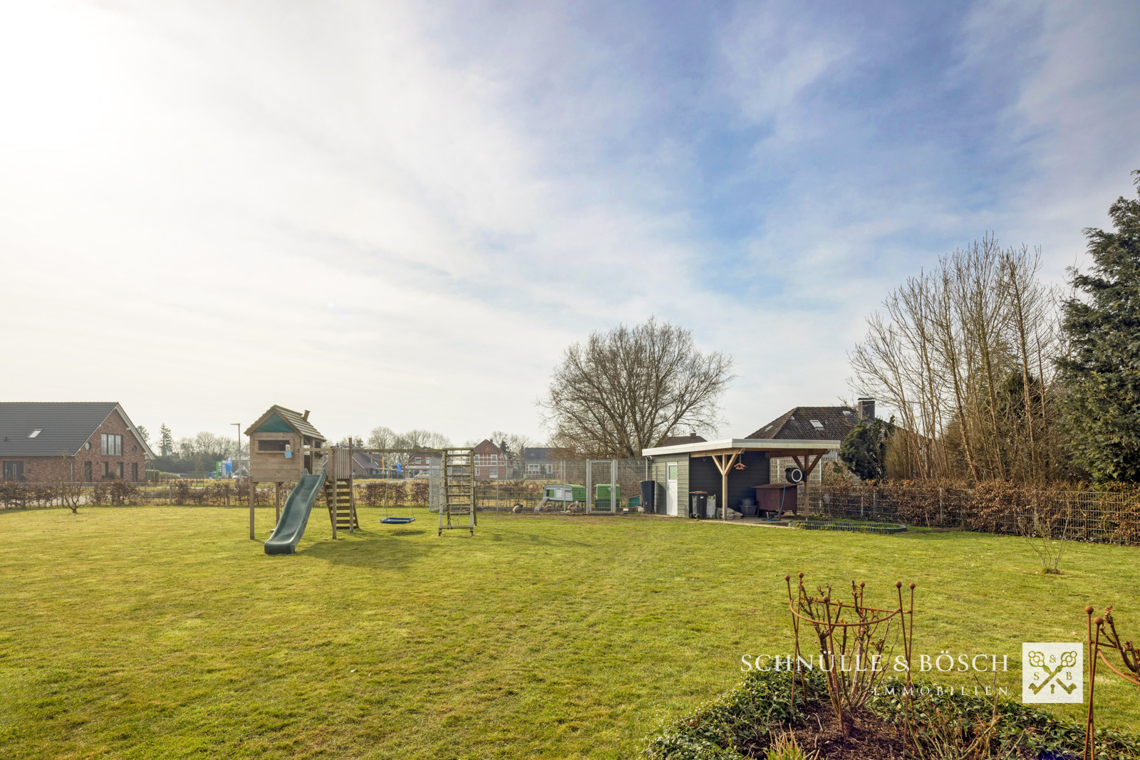 Und nun lassen Sie uns unbedingt über den Garten sprechen! Das Grundstück umfasst eine Fläche von 1.850 m² und schafft hier für alle Familienmitglieder hinreichend Platz für individuelle Pläne. In der Doppelgarage mit elektrischen Toren können Sie eine kleine Werkstatt einrichten. Über den Hauswirtschaftsraum gelangen Sie von der Garage direkt in Haus. Auf dem Grundstück sind zurzeit ein Hühnerstall und ein Gartenhaus sowie Spielgeräte für die Kinder vorhanden.