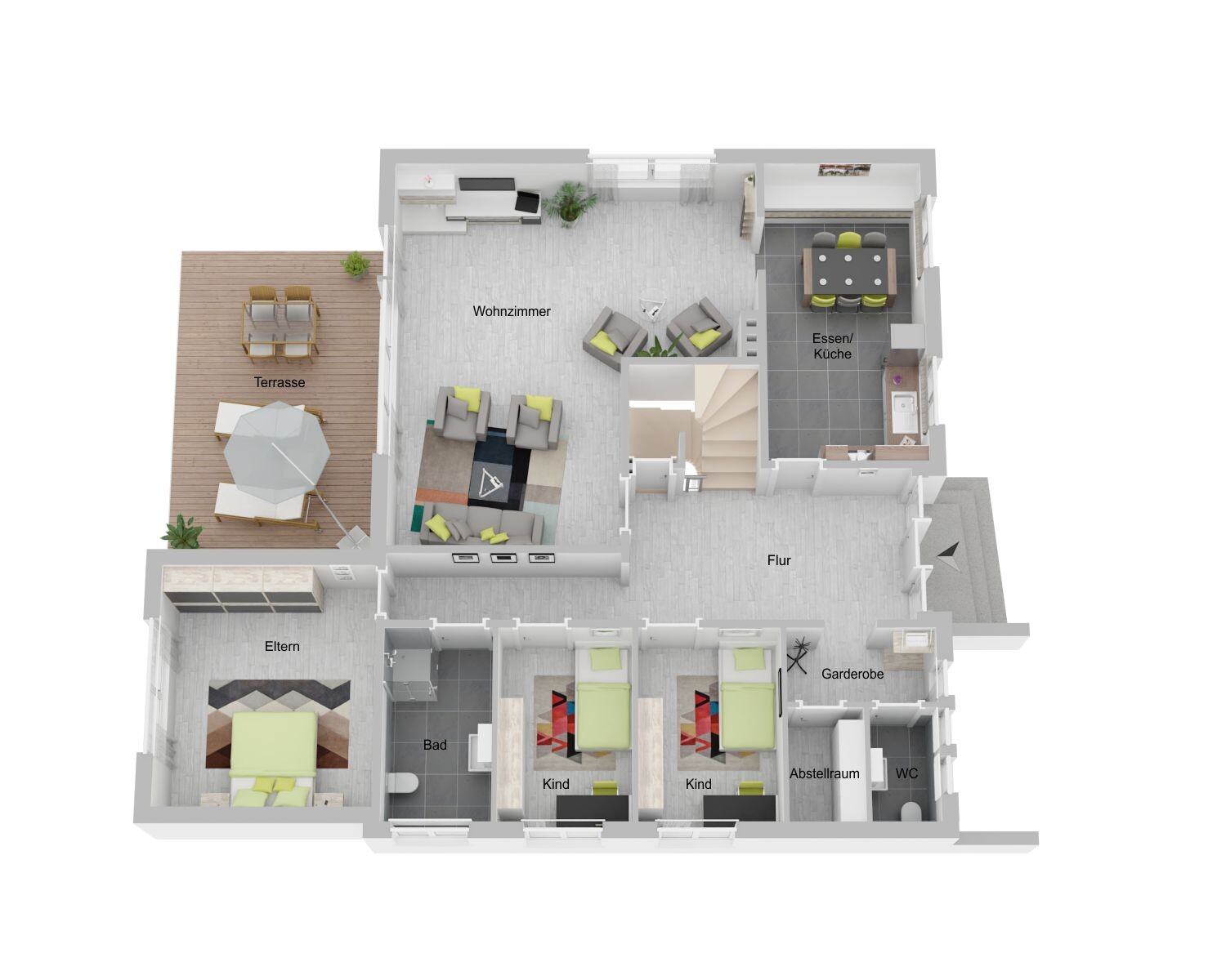 Erdgeschoss: Wohn- u. Esszimmer, 3 Schlafräume, Bad, Küche mit Essbereich, Gäste-WC und Abstellkammer