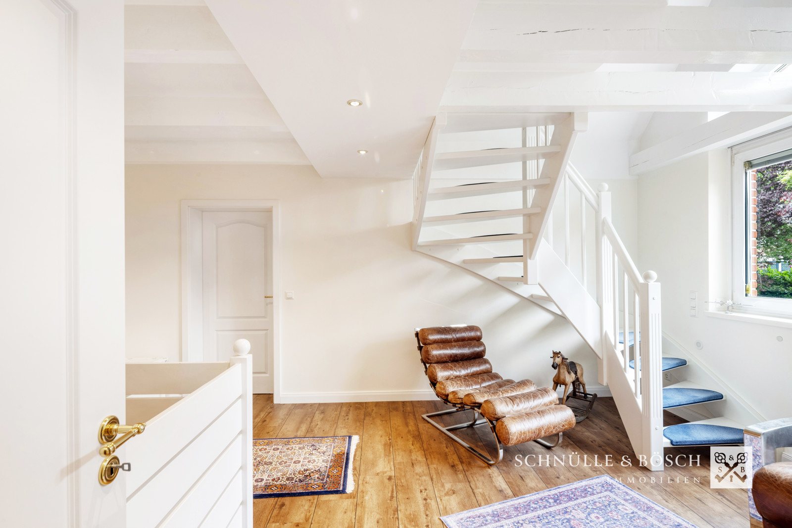 Sie erreichen den blickdichten Garten durch eine der zwei Zugangstüren oder über die Doppelgarage, in der auch Ihre E-Fahrzeuge direkt geladen werden könnte. Sie und Ihre Gäste werden von dem charmanten Kapitänsgiebel begrüßt und gelangen ebenerdig durch die Doppelflügeltür in die einladende Diele des Erdgeschosses. Hier befinden Sie im Mittelpunkt des Hause, denn von hier aus erreichen Sie über die wunderschöne Vollholztreppe die anderen Stockwerke und haben auch einen Zugang zur Einliegerwohnung. Im Erdgeschoss wurde bei der Sanierung 2017 viel Wert auf das Zusammenspiel aus alten Elementen und neuen Ideen gelegt. In der offenen Küche, die mit einer modernen Kücheninsel ausgestattet ist, befindet sich auch ein Essplatz für bis zu sechs Personen. Von hier aus können Sie direkt auf die knapp 50m² große und überdachte Terrasse gelangen. Sie haben also die Wahl, ob Sie im Haus oder doch lieber draußen in Ihrem Garten mit Blick auf das Teehaus und das Wasserspiel frühstücken möchten. Neben der Küche liegt das Wohnzimmer, welches durch eine Schiebetür mit dem Esszimmer verbunden ist. Der Kamin im Wohnzimmer lädt zu gemütlichen Abenden ein. Die Garderobe und das Gäste-WC runden diese Etage ab.
