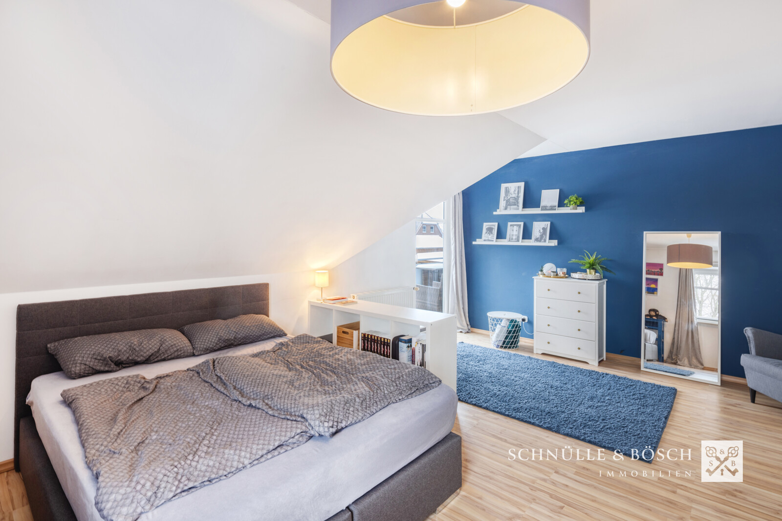 Das Schlafzimmer, welches auch über einen Zugang zur Loggia verfügt, besticht durch seine Fläche von ca. 22m² und schafft so Platz für ausreichend Schränke und Kommoden. Neben dem Schlafzimmer ist praktischerweise das Badezimmer platziert. Das Vollbad mit Wanne und Dusche ist 2019 renoviert worden und hat noch eine Tür zu einem Abstellraum. Der Vorbesitzer hatte hier den Einbau einer Sauna geplant. Komplettiert wird die Wohnung auf dieser Ebene durch einen Hauswirtschaftsraum und das Gäste-WC.