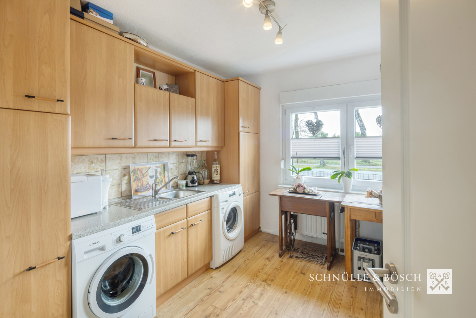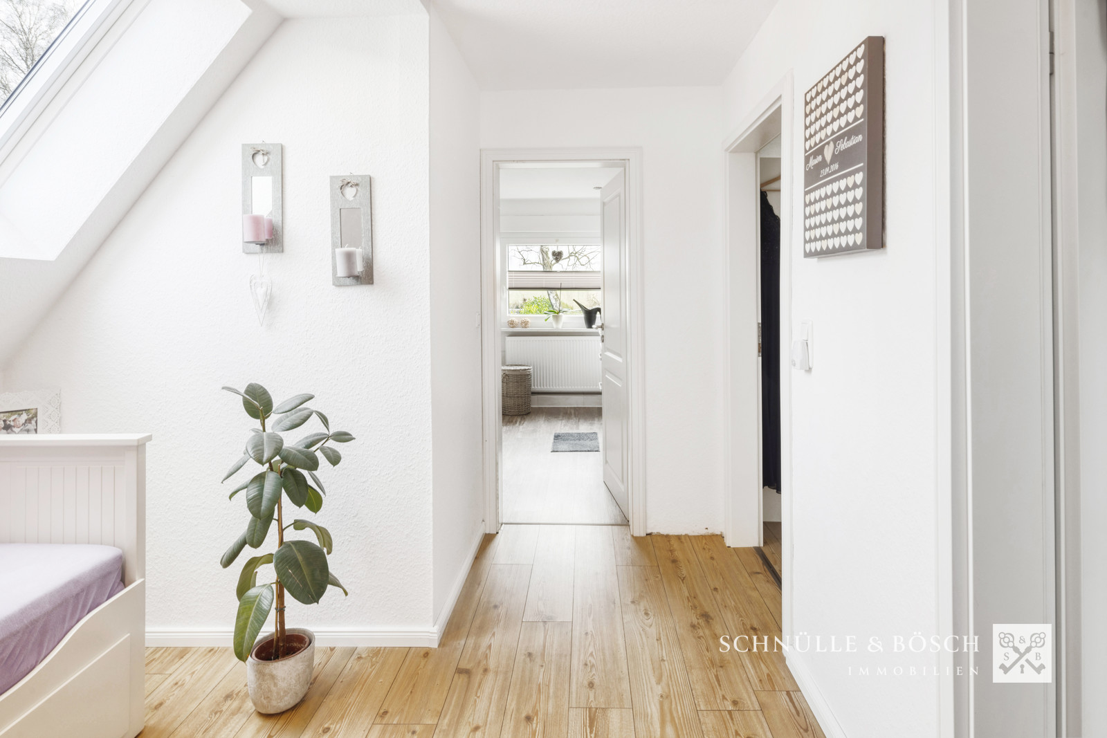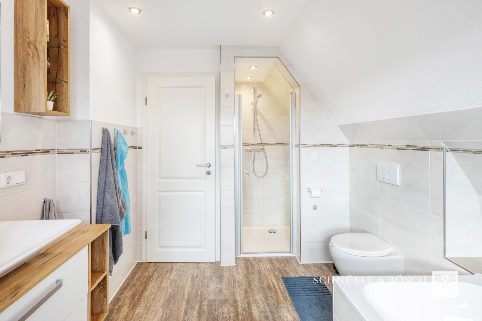 Herzliche Willkommen! Über ein paar Stufen gelangen Sie in das Haus und werden von der hellen Raumgestaltung begrüßt. Sie finden im Erdgeschoss einen großzügigen Hauswirtschaftsraum, das Wohn- und Esszimmer mit offener Küche, sowie ein Badezimmer mit Dusche. Vom Treppenhaus aus geht es ins Obergeschoss, wo sich zwei wunderschöne Schlafzimmer und das Badezimmer mit Badewanne und Dusche befindet. Der Dachboden ist vollständig gedämmt und hält zusätzliche Staufläche bereit.
