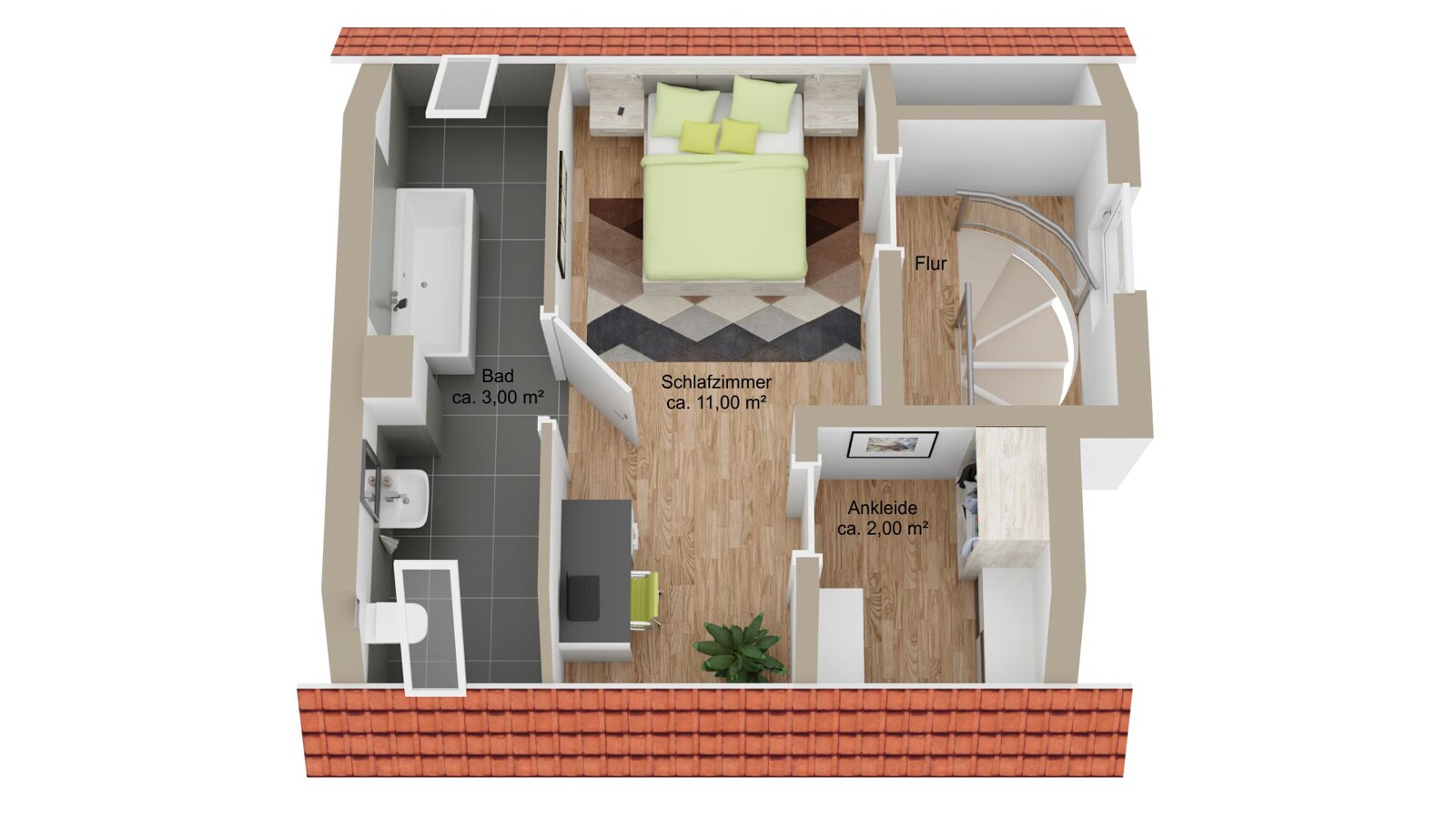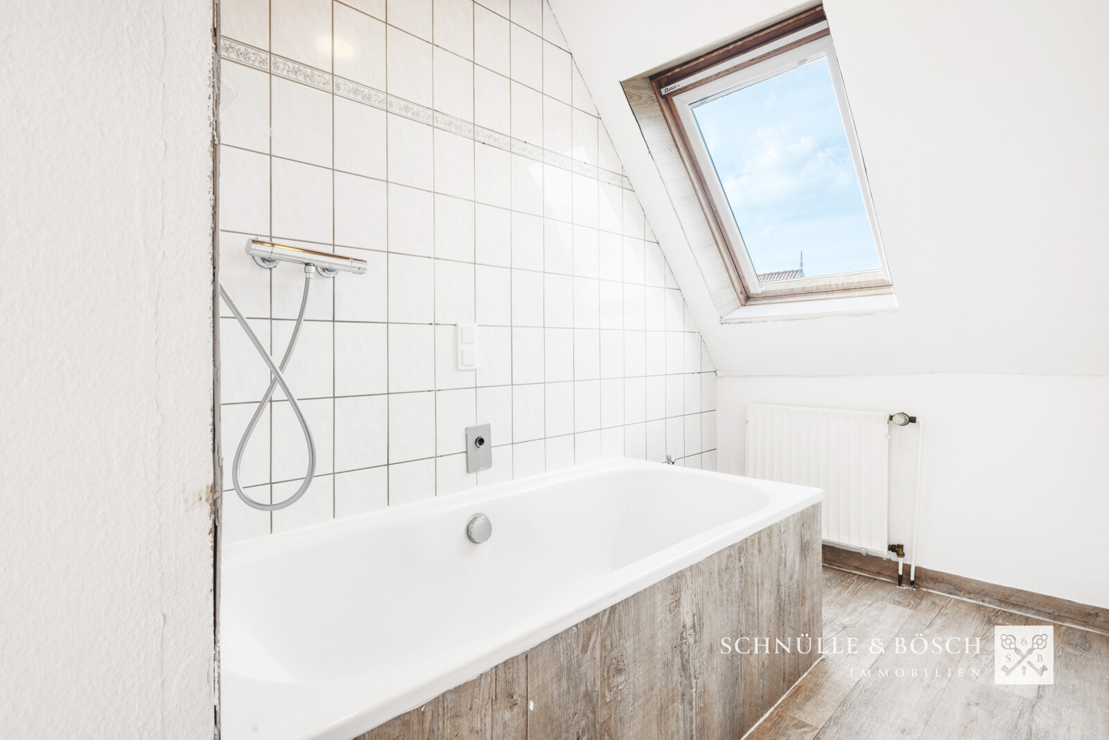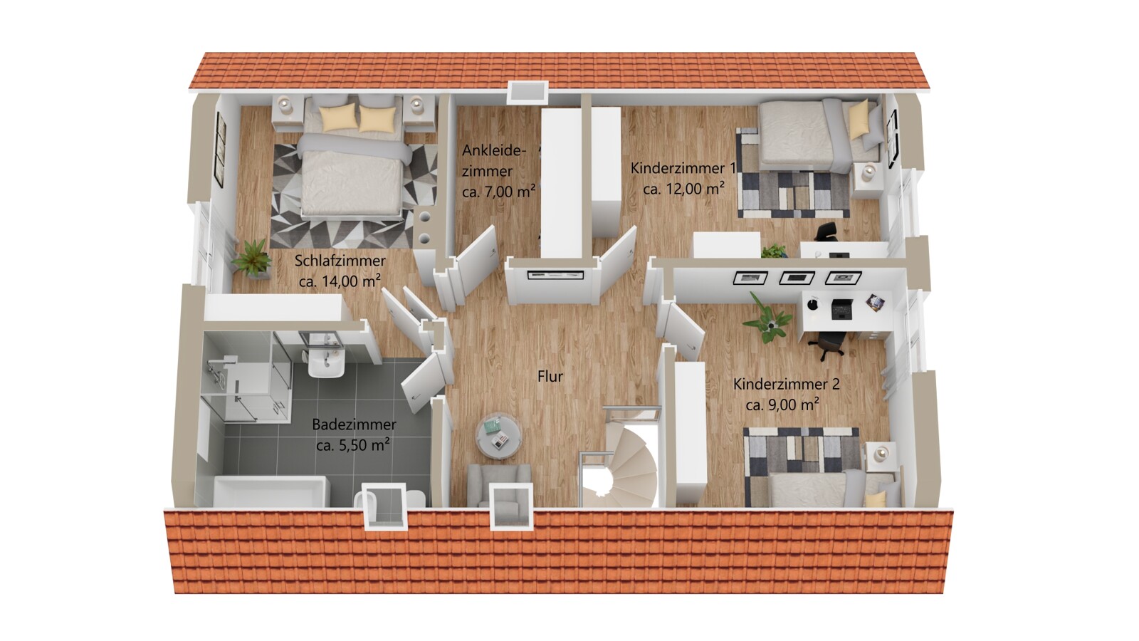 Im Dachgeschoss geht es weiter mit vier hellen Schlafzimmern und einem Vollbad mit Dusche und Wanne. Das große Schlafzimmer hat sogar einen direkten Zugang zum Bad.