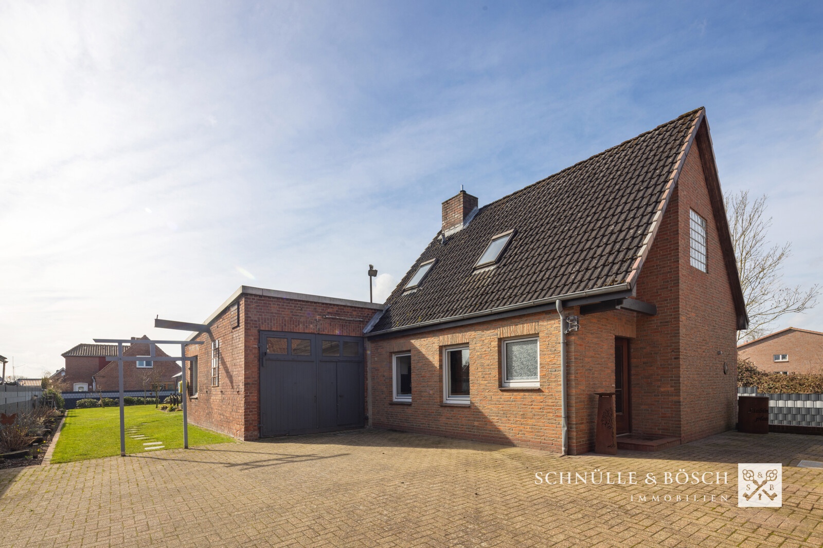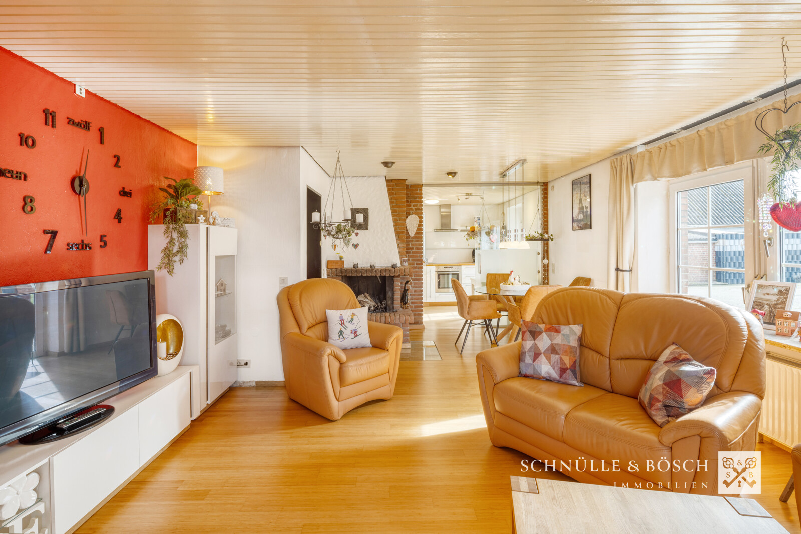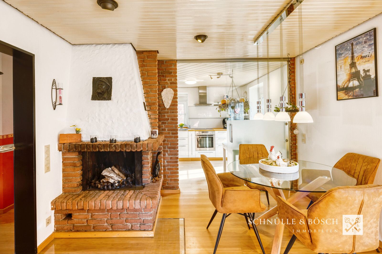 Das vordere der beiden Häuser - ein schönes Backsteinhaus - empfängt Sie hier. Durch die weiße Eingangstür gelangen Sie in den hellen Eingangsbereich dieses Einfamilienhauses. Hier erwarten Sie ein großzügiges Wohn- und Esszimmer mit offener Küche, die durch eine Glaswand getrennt werden kann. Der gemauerte Kamin verschafft dem ganzen Haus, auch bei kälteren Temperaturen, eine wohlige Wärme. Das Gäste-WC, der Hauswirtschaftsraum und ein weiteres Zimmer, welches als Büro genutzt wurde, runden diese Etage ab.