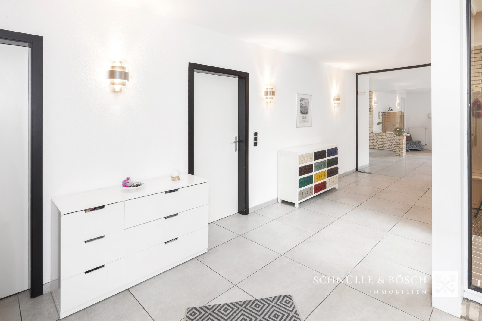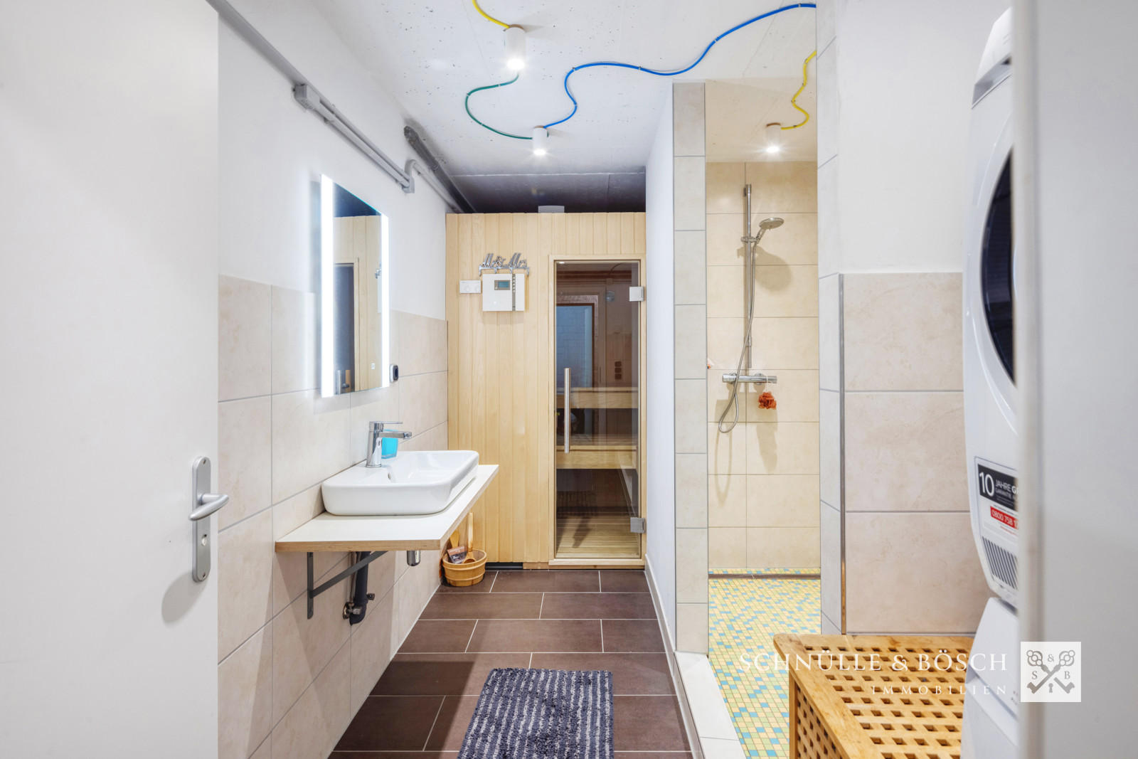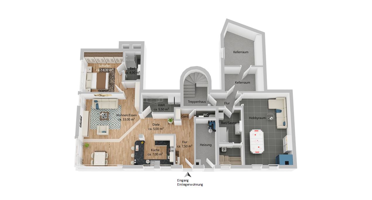 Das Untergeschoss gliedert sich in zwei Bereiche: Zum einen der Kellerbereich, der zum Haupthaus gehört und in dem sich zwei Abstellräume, ein Hobbyraum und das Sauna-Bad befinden und zum anderen die Einliegerwohnung des Hauses. Die zurzeit vermietete Wohnung verfügt über ca. 76m² und einen offenen Wohn- und Essbereich. Ein Schlafzimmer mit direktem Bad sowie eine moderne Küche, ein Hauswirtschaftsraum und ein Gäste-WC gehören ebenfalls zu dieser Wohnung.