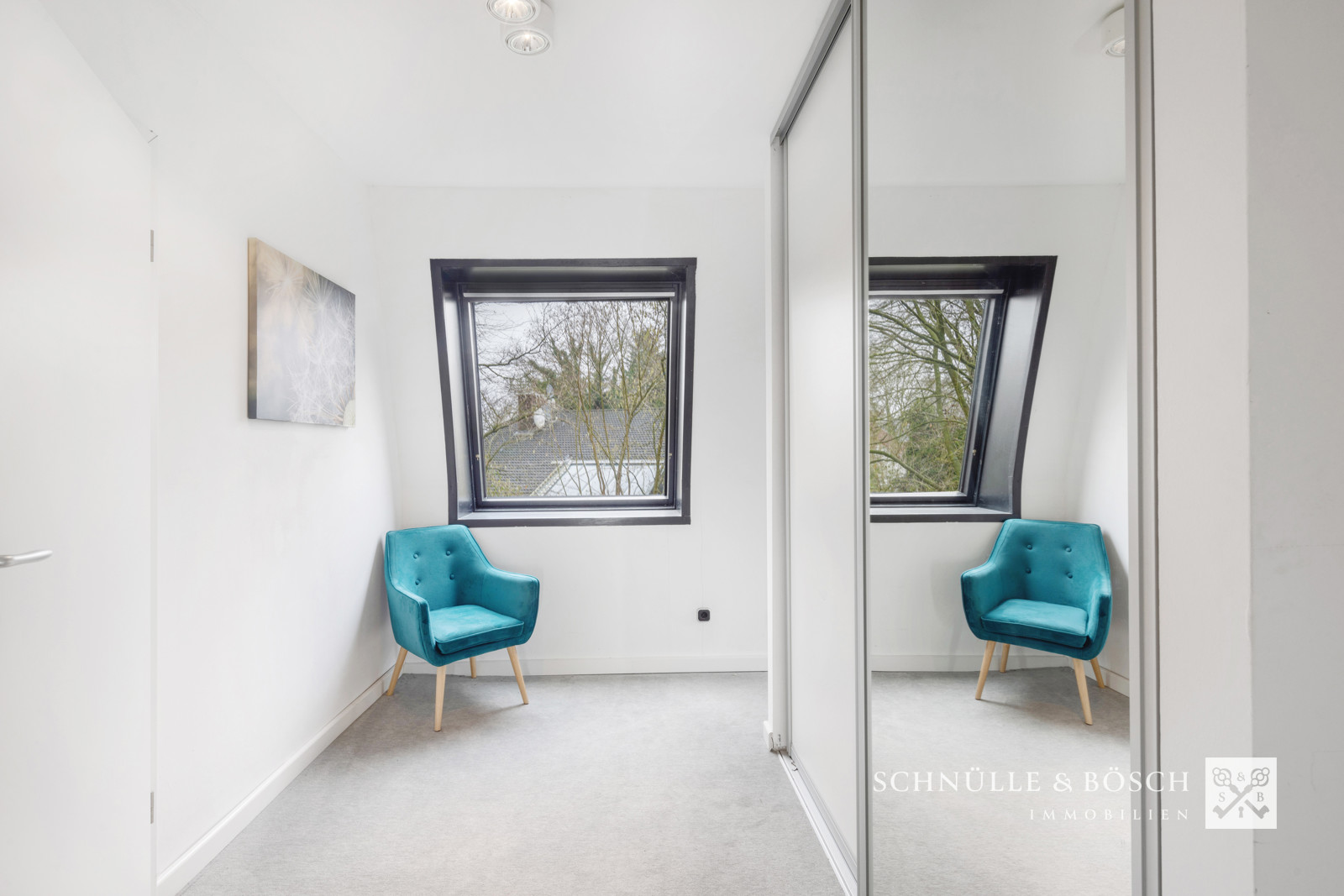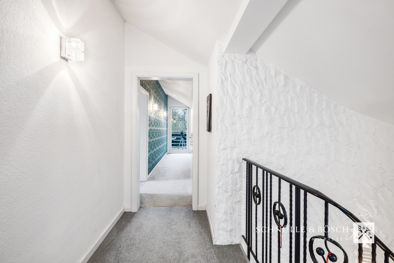 Vom geschwungenen Treppenhaus aus gelangen Sie ins Obergeschoss, in dem sich ein Schlafzimmer mit großzügigem Master-Bad und Zugang zur Loggia, sowie ein weiteres Schlaf- oder Kinderzimmer mit begehbarem Kleiderschrank befindet. Von der Galerie aus, können Sie hinab in den offenen Wohnbereich schauen oder den zweiten Zugang zur Loggia nutzen und die Sonne genießen.