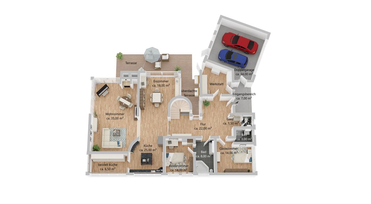 Das Haus bietet für die Einliegerwohnung einen Außenstellplatz und in der Doppelgarage Platz für zwei weitere Fahrzeuge und Fahrräder.