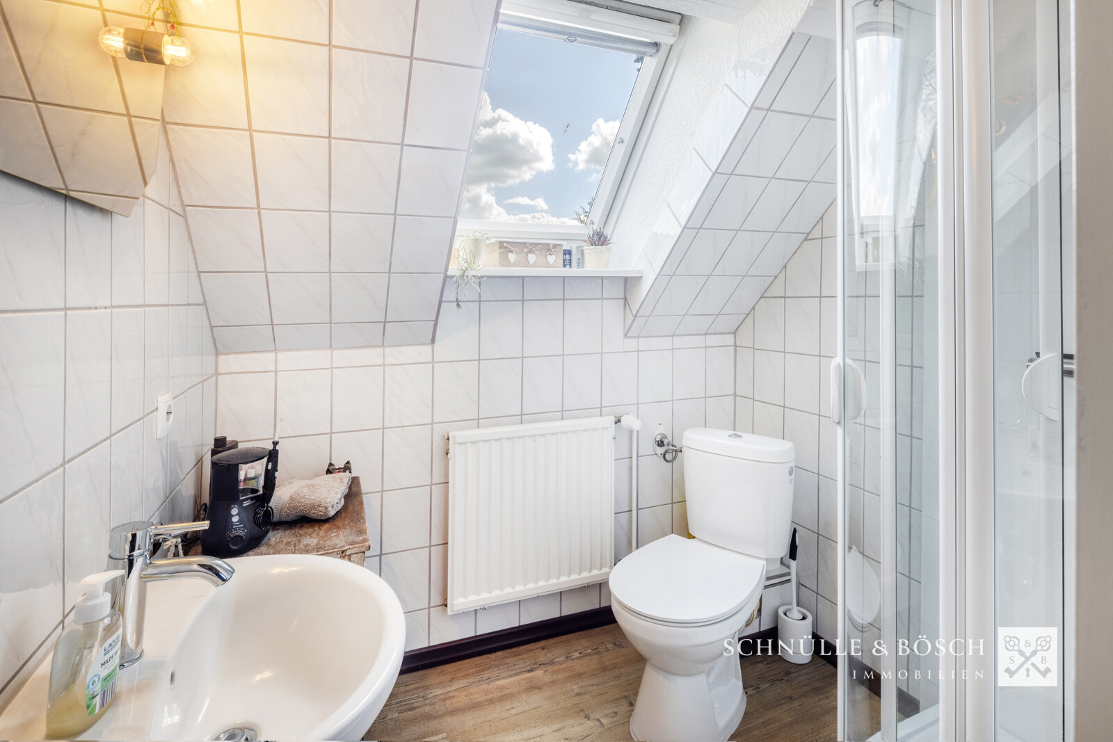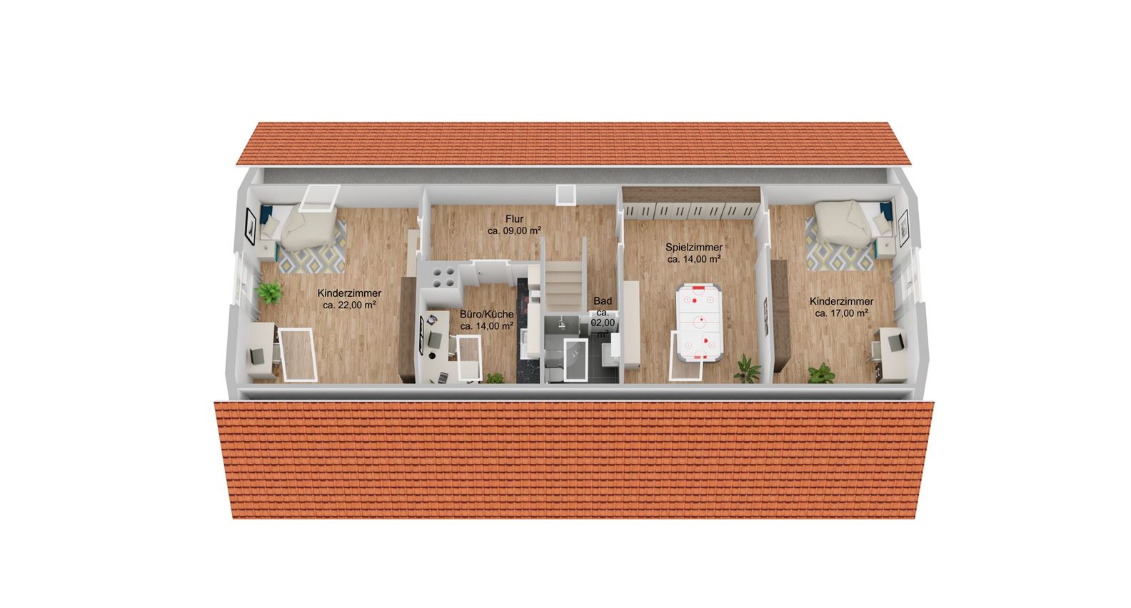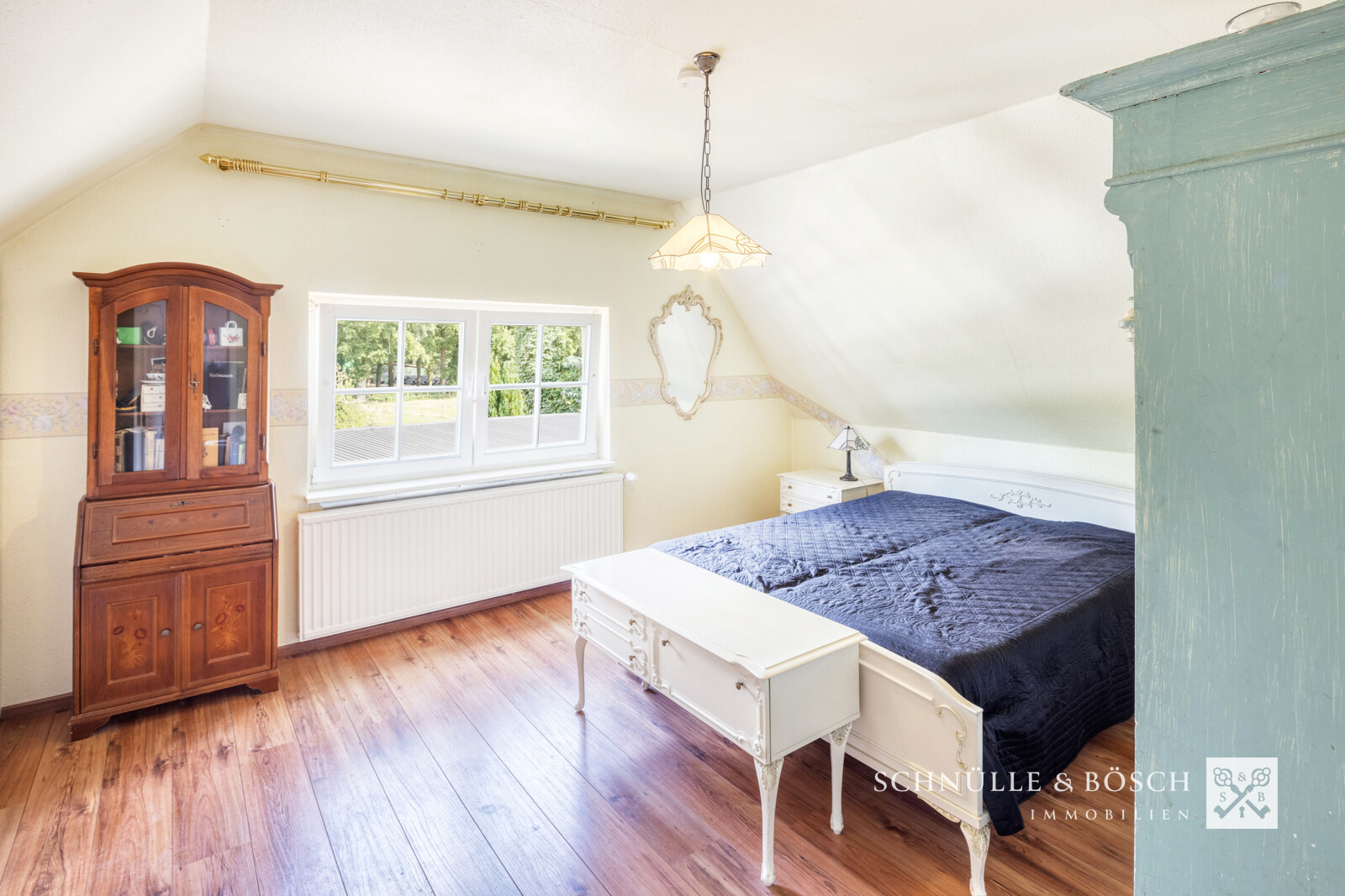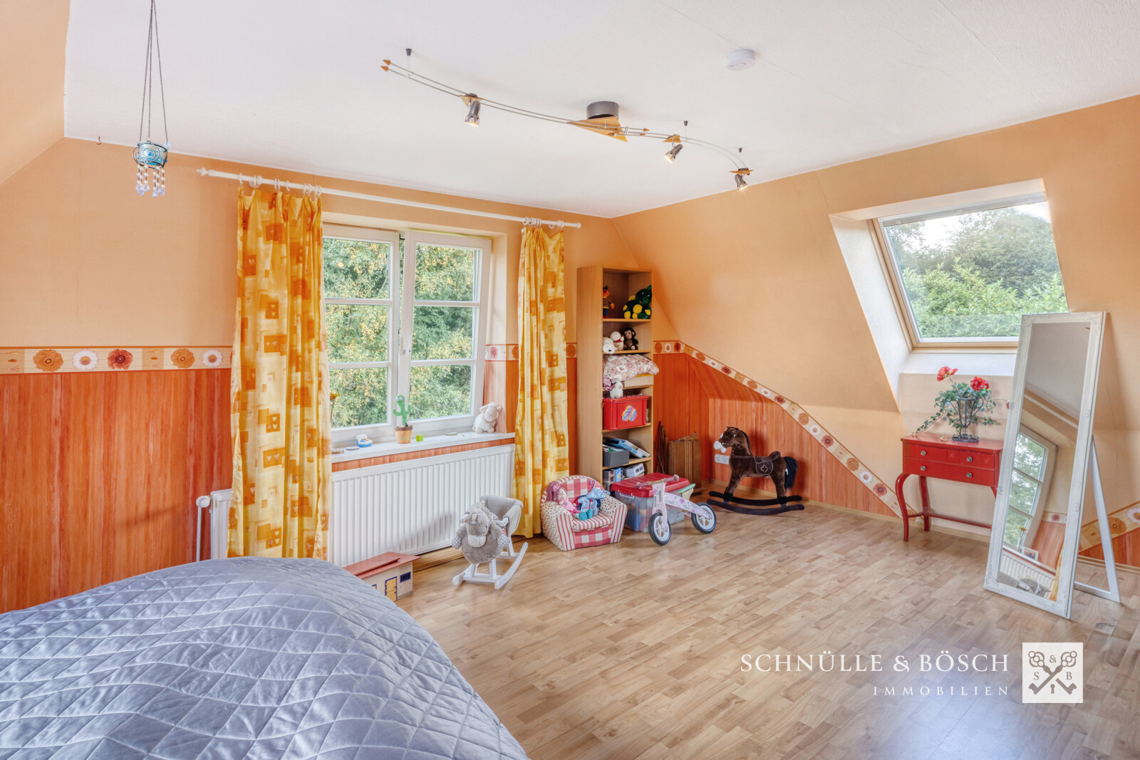 Im Dachgeschoss sind zwei weitere Schlafzimmer, ein Bad mit Dusche, ein Büro sowie ein Durchgangszimmer, welches als Lounge oder Spielzimmer genutzt werden kann, untergebracht. Vom aktuellen Schlafzimmer aus haben Sie am Morgen einen tollen Blick auf die Stallungen und seine Bewohner.
