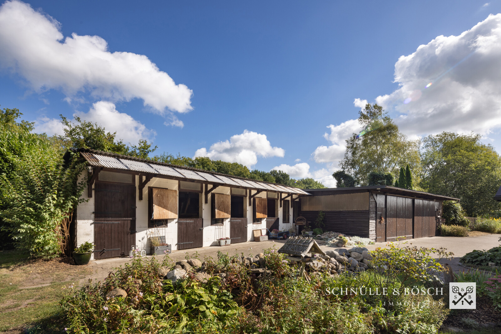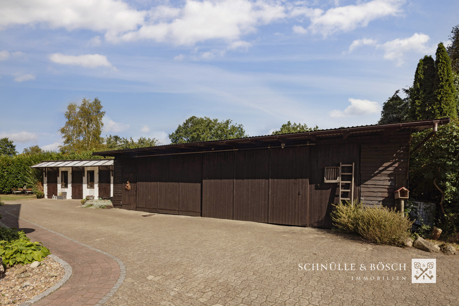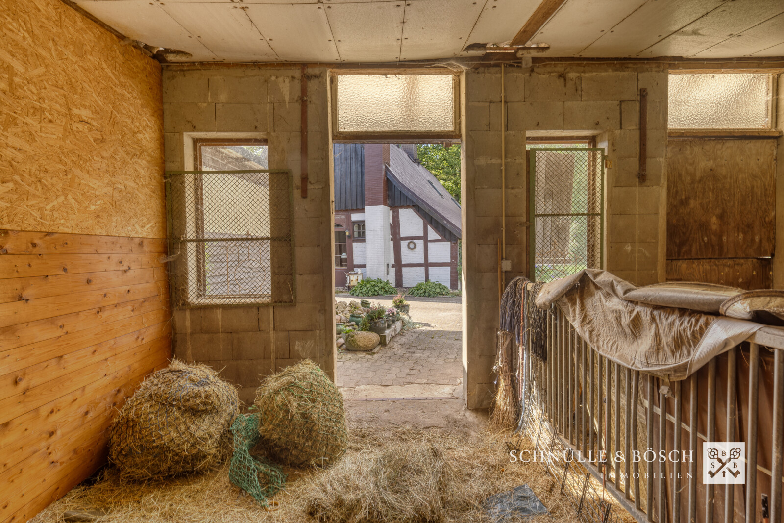 Neben dem Wohnhaus befinden sich die Scheune, in der bis zu drei Fahrzeuge (3,5m Höhe) Platz finden sowie eine Werkstatt und weiterer Stauraum. Von der Scheune aus geht es direkt in die Sattelkammer und zu den Pferdeboxen. Jede Box erhält durch die Fenster ausreichend Tageslicht und hat eine eigene Tür auf den Hof. Aktuell sind es zwei Boxen und es besteht die Möglichkeit zwei weitere Boxen herzurichten. Hier können Pferde und Reiter gemeinsam Zeit verbringen. Aufgrund der Lage des Hofes kann Ihr Ausritt in die umliegenden Wälder direkt vor der Haustür starten und der Feierabend auf dem Rücken Ihres Pferdes beginnen.