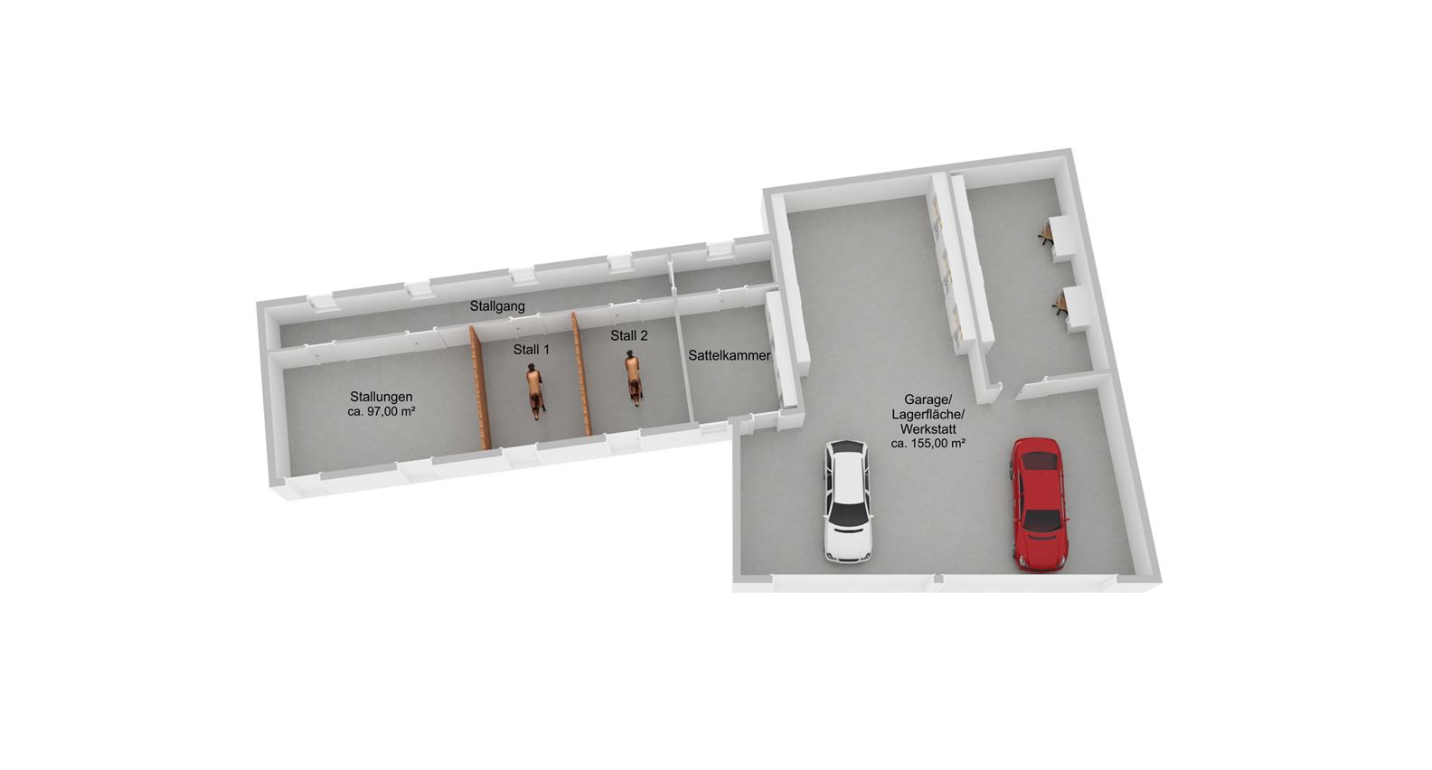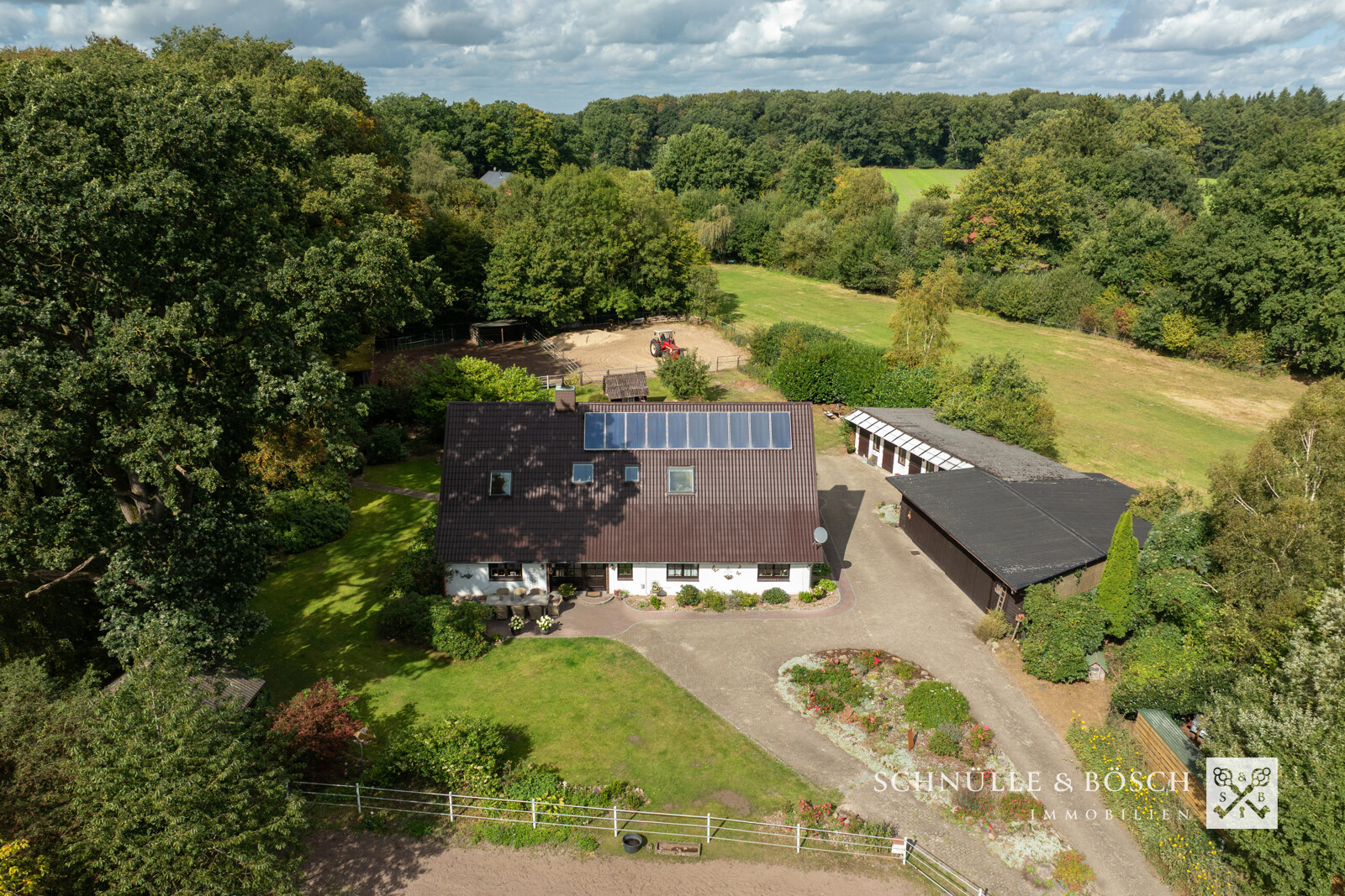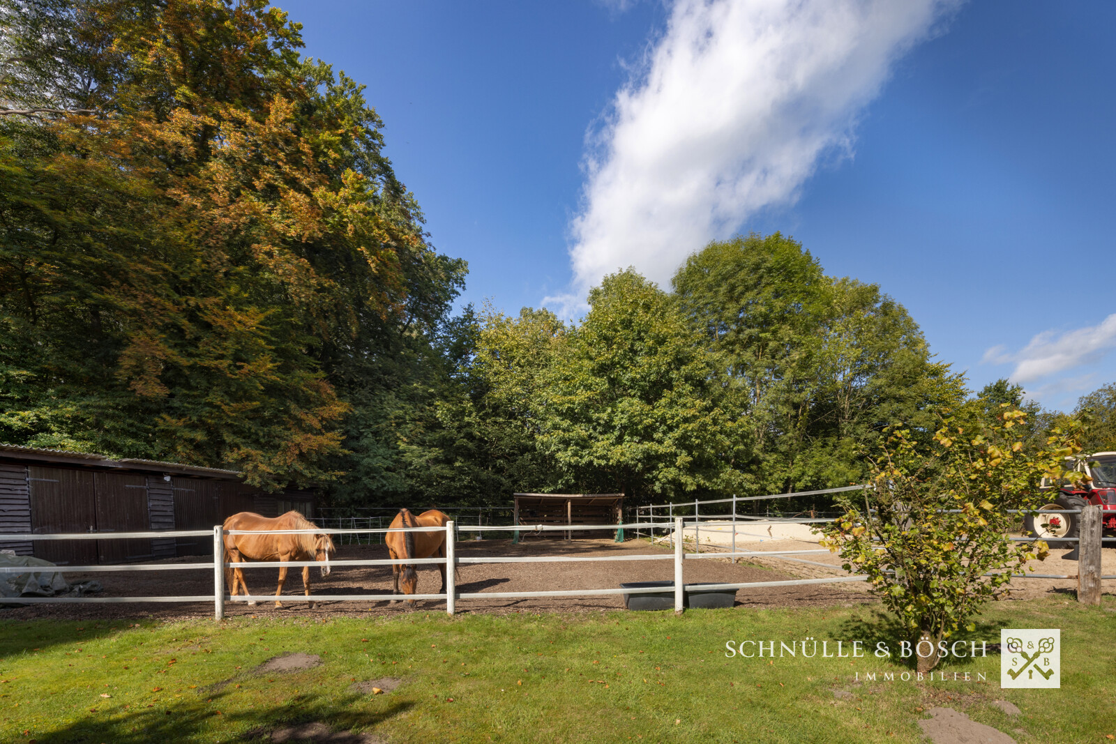 Neben dem Wohnhaus befinden sich die Scheune, in der bis zu drei Fahrzeuge (3,5m Höhe) Platz finden sowie eine Werkstatt und weiterer Stauraum. Von der Scheune aus geht es direkt in die Sattelkammer und zu den Pferdeboxen. Jede Box erhält durch die Fenster ausreichend Tageslicht und hat eine eigene Tür auf den Hof. Aktuell sind es zwei Boxen und es besteht die Möglichkeit zwei weitere Boxen herzurichten. Hier können Pferde und Reiter gemeinsam Zeit verbringen. Aufgrund der Lage des Hofes kann Ihr Ausritt in die umliegenden Wälder direkt vor der Haustür starten und der Feierabend auf dem Rücken Ihres Pferdes beginnen.