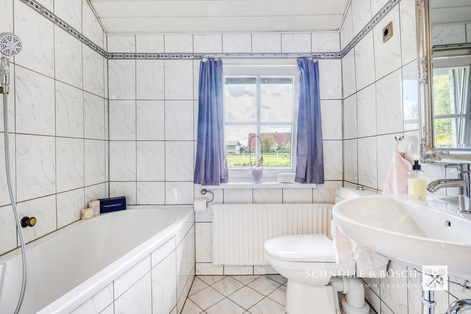 Von der schönen Diele aus, in der sich ein wasserführender Kamin befindet, gelangen Sie in alle Räume des Hauses und in die obere Etage. Rechts entlang erreichen Sie das helle Wohn- und Esszimmer, welches mit seinen knapp ca. 58m² viel Platz für die ganze Familie bietet. Weiter befinden sich im Erdgeschoss das Badezimmer mit Wanne, ein Abstellraum, ein Ankleide- bzw. Fitnessraum, ein Schlafzimmer oder Büro sowie die Küche mit angrenzendem HW-Raum. Von der Küche über den Hauswirtschaftsraum kommen Sie durch die Hintertür direkt wieder in den wundervollen rückwärtigen Garten.