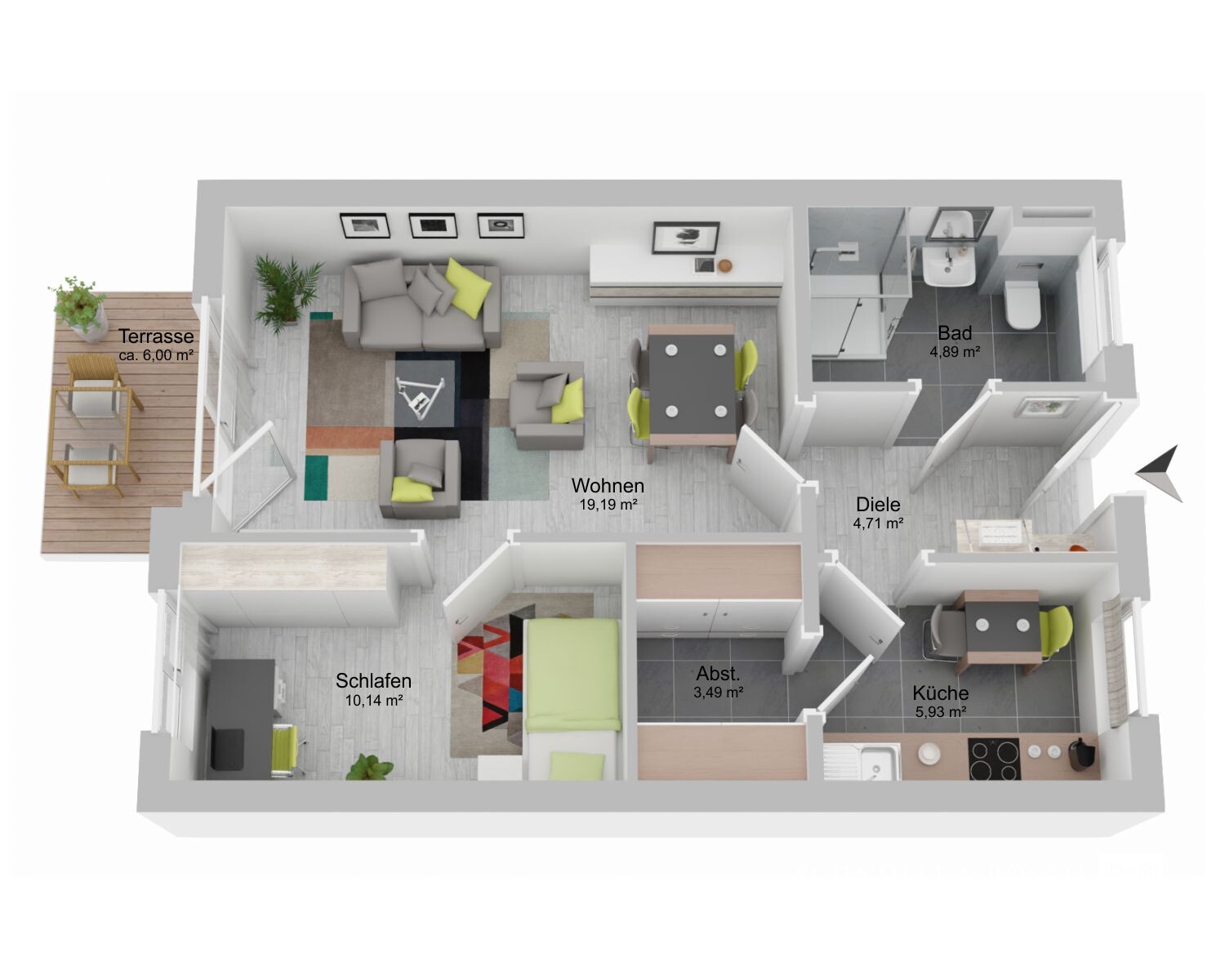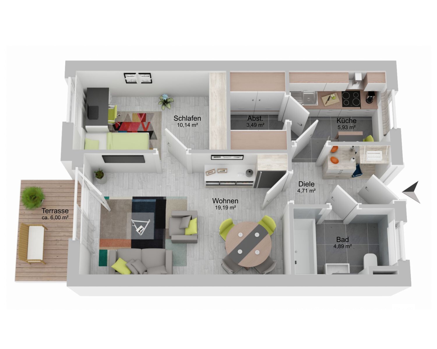 - Wohnung 1: EG ca. 49,85 m², 2 Zimmer, Küche, Bad, Terrasse