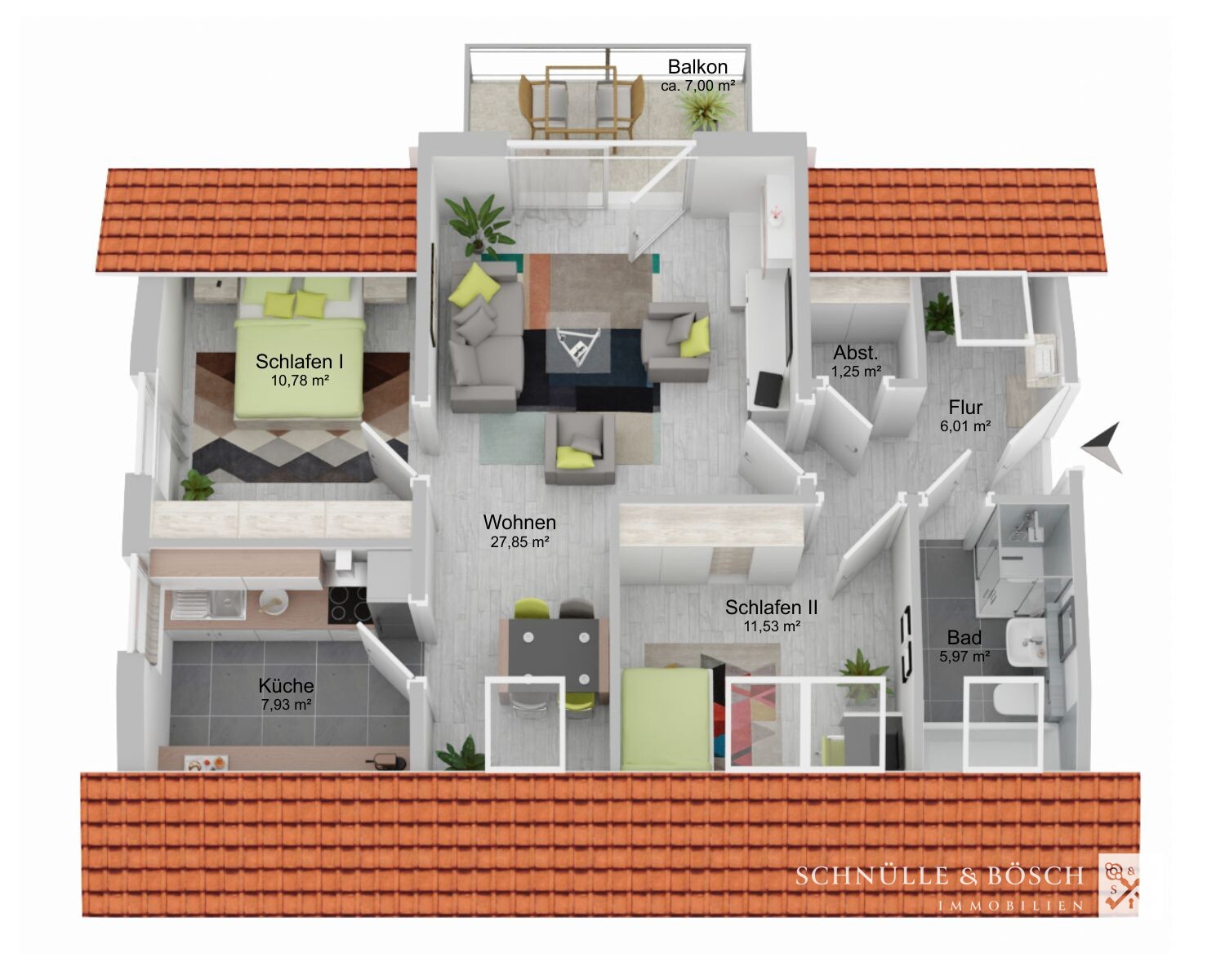- Wohnung 3: 1. OG ca. 74,83 m², 3 Zimmer, Küche, Bad, Balkon, Abstellraum